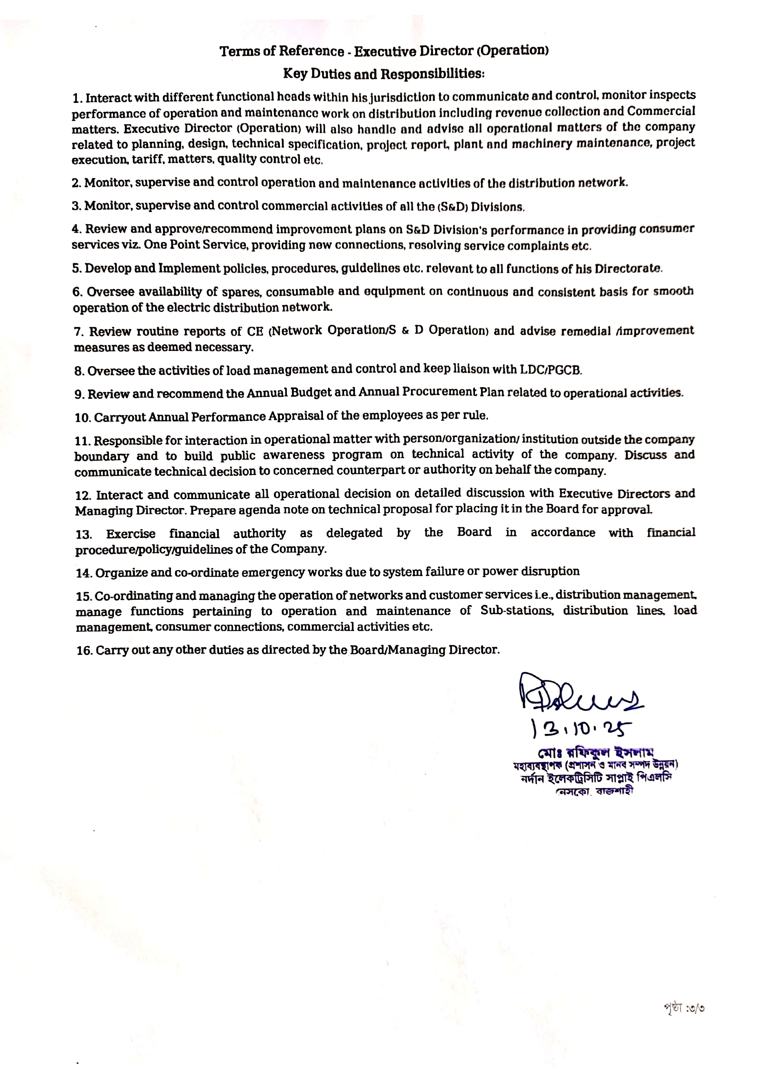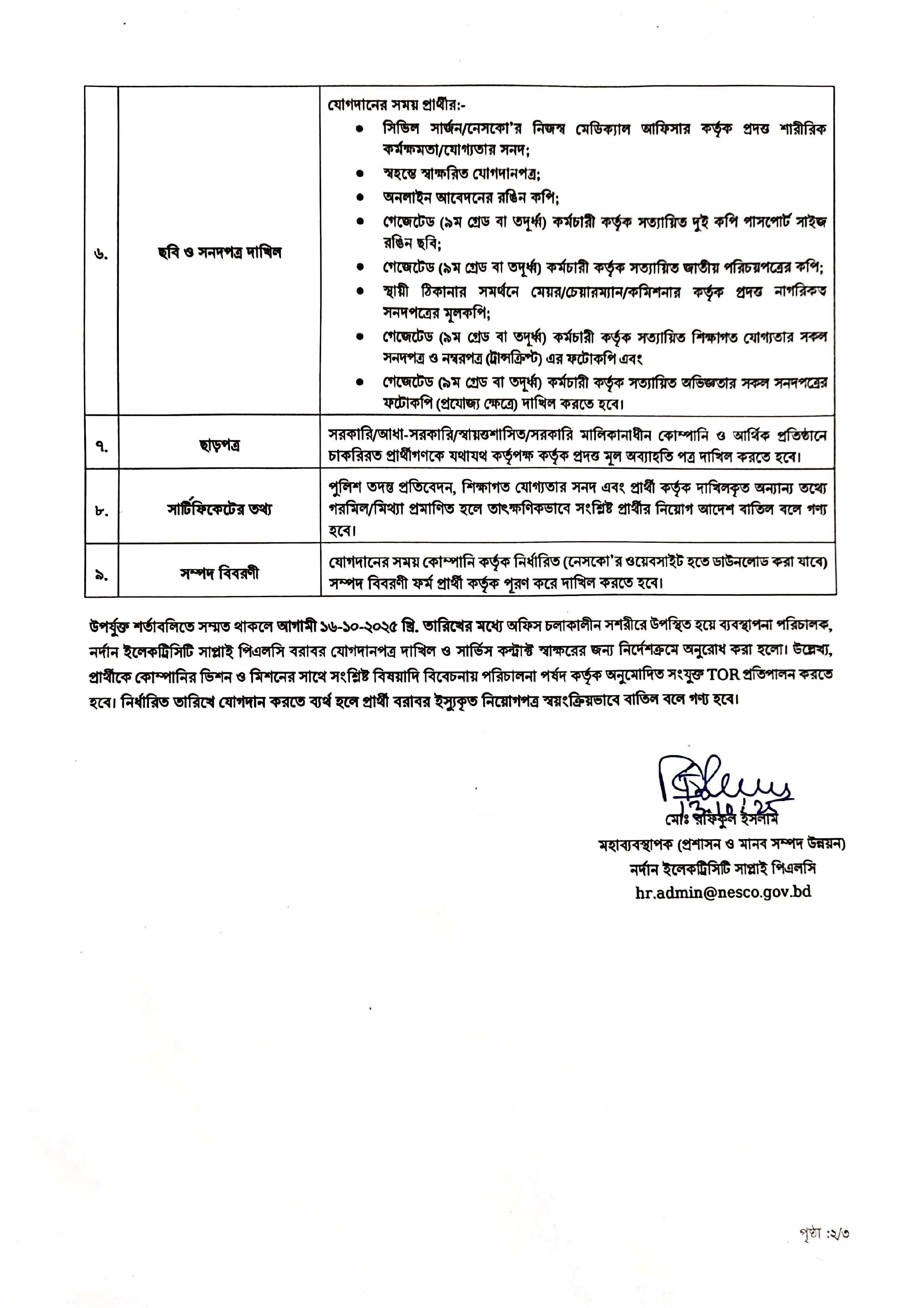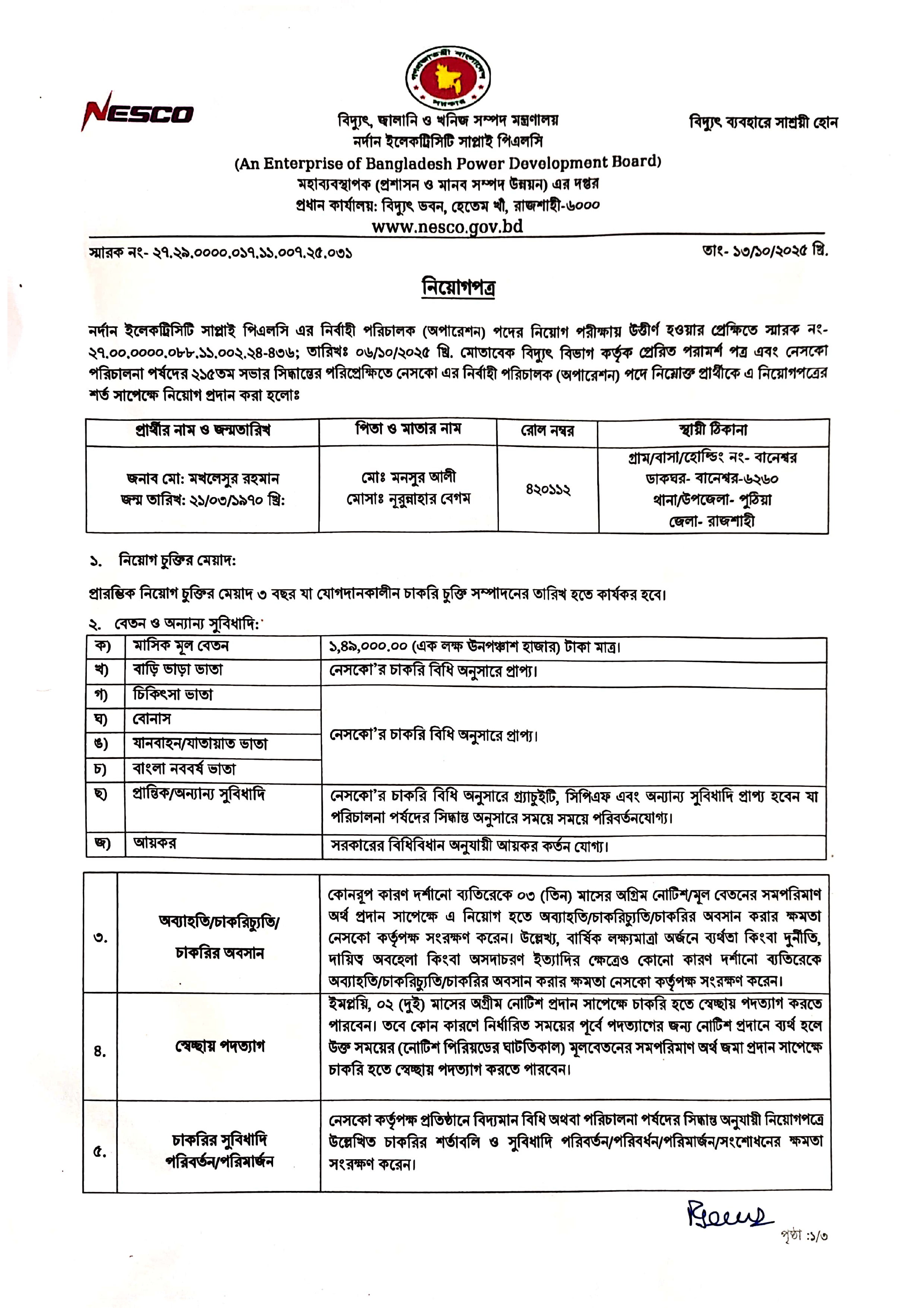 নর্দান ইলেকট্রিসিটি সাপ্লাই পিএলসি (নেসকো) নির্বাহী পরিচালক (অপারেশন) পদে একজন প্রার্থীকে নিয়োগ প্রদান করেছে। এই নিয়োগপত্রটি বিদ্যুৎ বিভাগ কর্তৃক প্রেরিত পরামর্শ পত্র এবং নেসকো পরিচালনা পর্ষদের ২১৫তম সভার সিদ্ধান্তের পরিপ্রেক্ষিতে জারি করা হয়েছে।