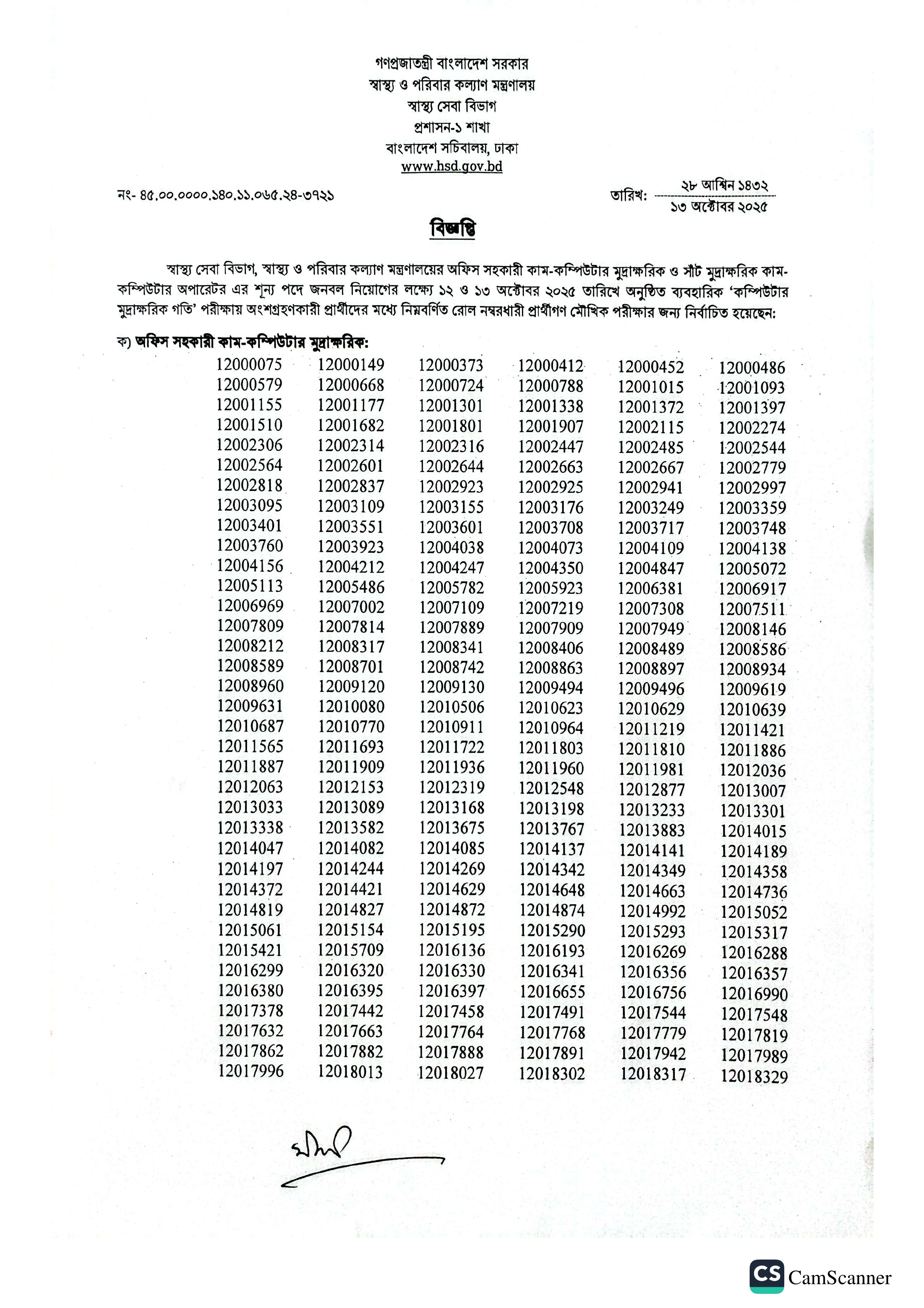 স্বাস্থ্য ও পরিবার কল্যাণ মন্ত্রণালয়ের স্বাস্থ্য সেবা বিভাগের অফিস সহকারী কাম-কম্পিউটার মুদ্রাক্ষরিক এবং সীট মুদ্রাক্ষরিক কাম-কম্পিউটার অপারেটর পদের ব্যবহারিক পরীক্ষার ফলাফল প্রকাশিত হয়েছে।
