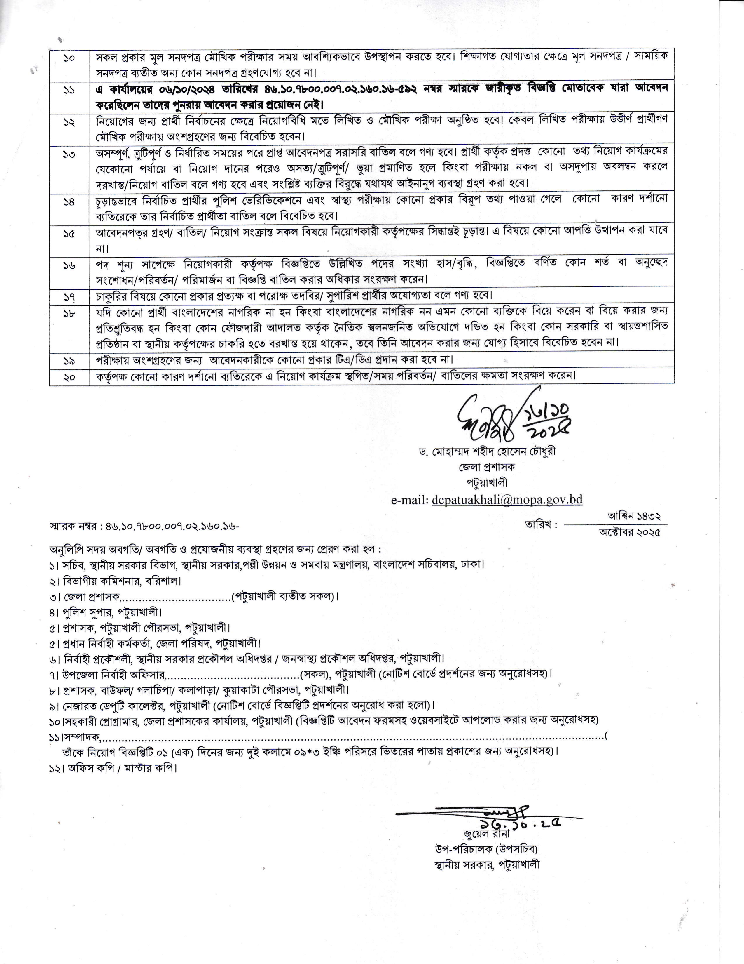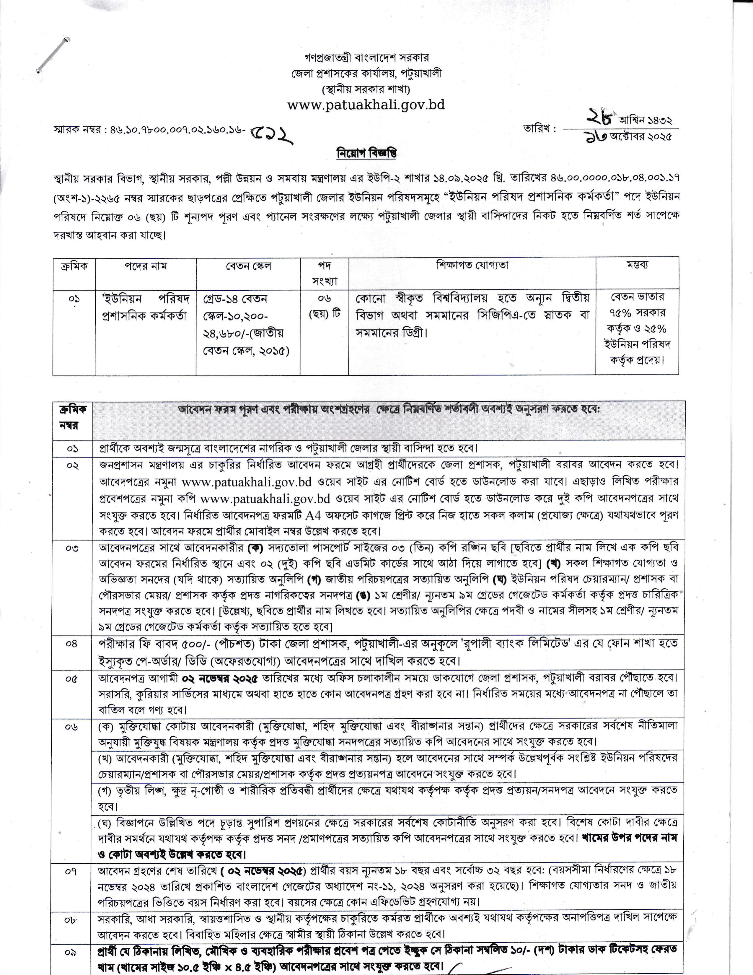 বয়সসীমা: ০২ নভেম্বর ২০২৫ তারিখে প্রার্থীর বয়স সর্বনিম্ন ১৮ বছর এবং সর্বোচ্চ ৩২ বছর হতে হবে। আবেদনকারীকে অবশ্যই জন্মসূত্রে বাংলাদেশের নাগরিক এবং পটুয়াখালী জেলার স্থায়ী বাসিন্দা হতে হবে।