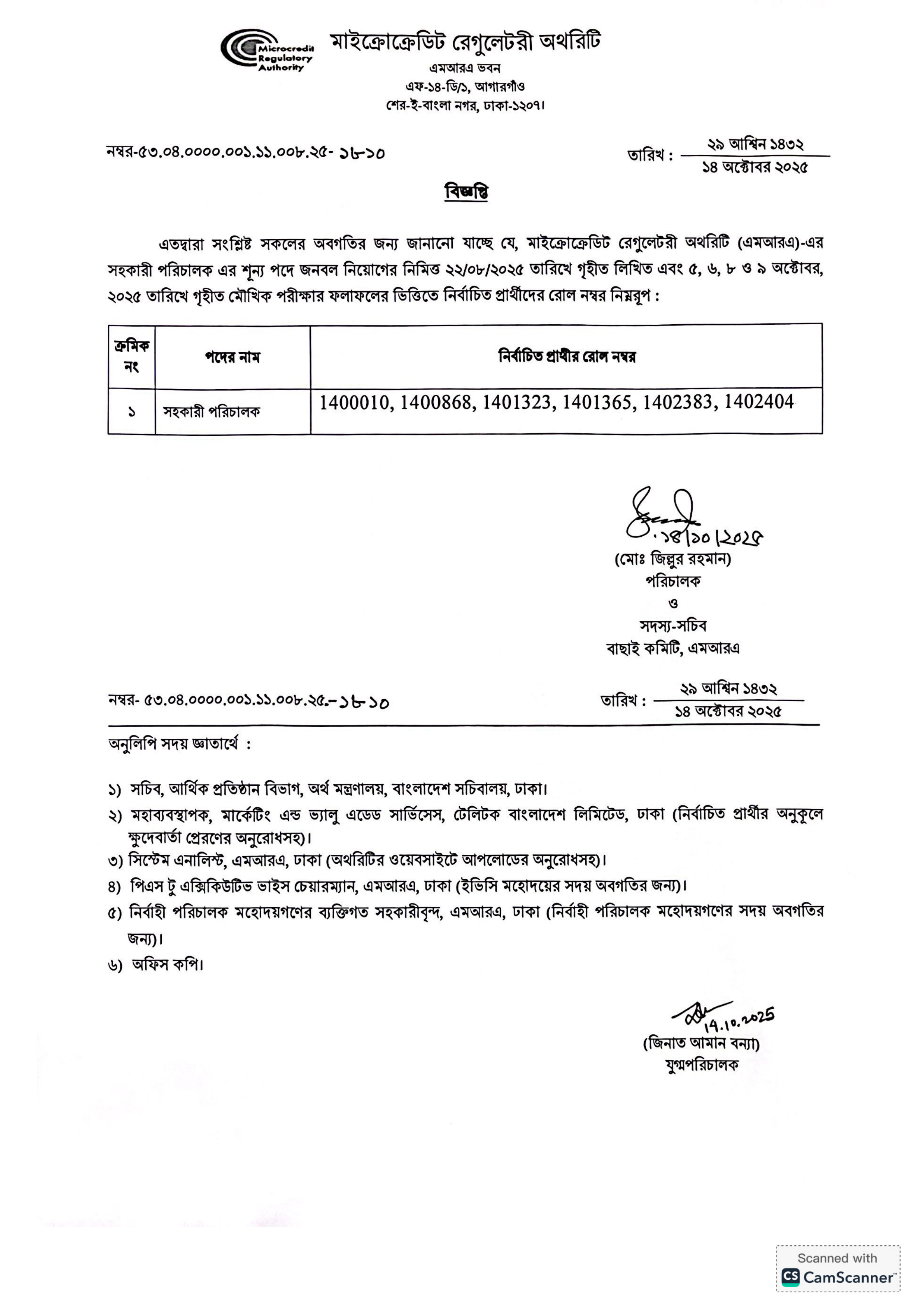 মাইক্রোক্রেডিট রেগুলেটরী অথরিটি (এমআরএ)-এর সহকারী পরিচালক শূন্য পদে জনবল নিয়োগের লক্ষ্যে গৃহীত লিখিত ও মৌখিক পরীক্ষার ফলাফল প্রকাশিত হয়েছে।