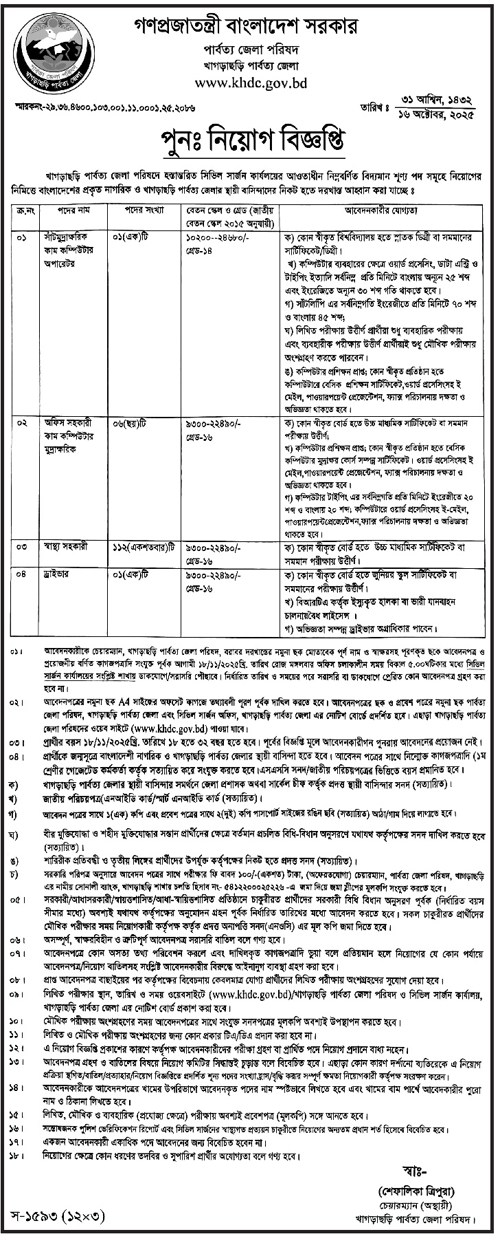 জেলা পরিষদ খাগড়াছড়ি এর সম্প্রতি ৪ টি পদে মোট ১১৯ জনকে নিয়োগের বিজ্ঞপ্তি প্রকাশ করেছে।বিজ্ঞপ্তি অনুসারে পদগুলোয় যোগ্যতা পূরণ সাপেক্ষে যোগ দিতে পারেন আপনিও।পদগুলোর আবেদন করা যাবে ১৮-১১-২০২৫ পর্যন্ত।