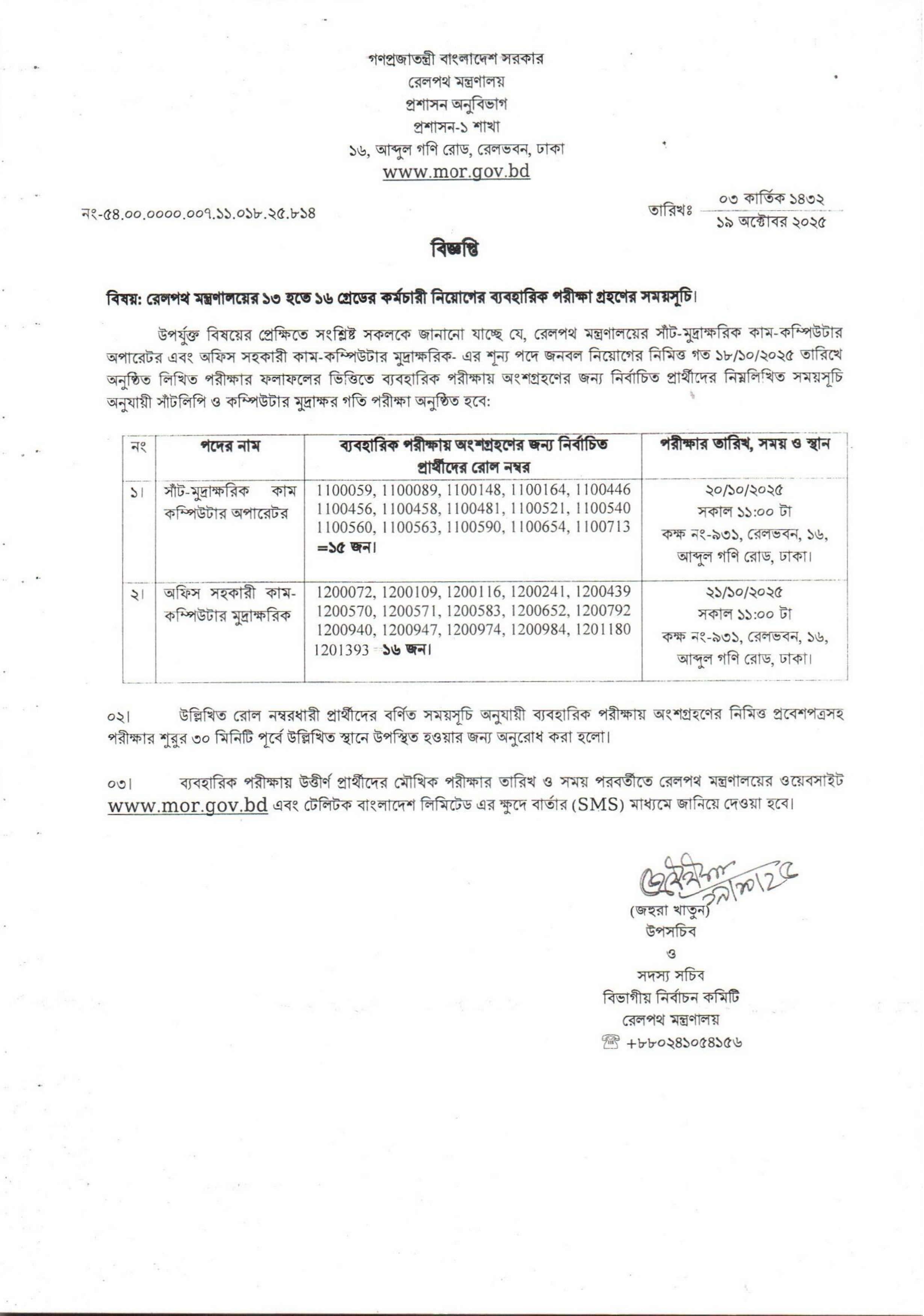 রেলপথ মন্ত্রণালয়ের ১৩ হতে ১৬ গ্রেডের শূন্য পদে জনবল নিয়োগের নিমিত্ত গত ১৮/১০/২০২৫ তারিখে অনুষ্ঠিত লিখিত পরীক্ষার ফলাফলের ভিত্তিতে ব্যবহারিক পরীক্ষায় অংশগ্রহণের জন্য নির্বাচিত প্রার্থীদের সময়সূচি প্রকাশ করা হয়েছে।