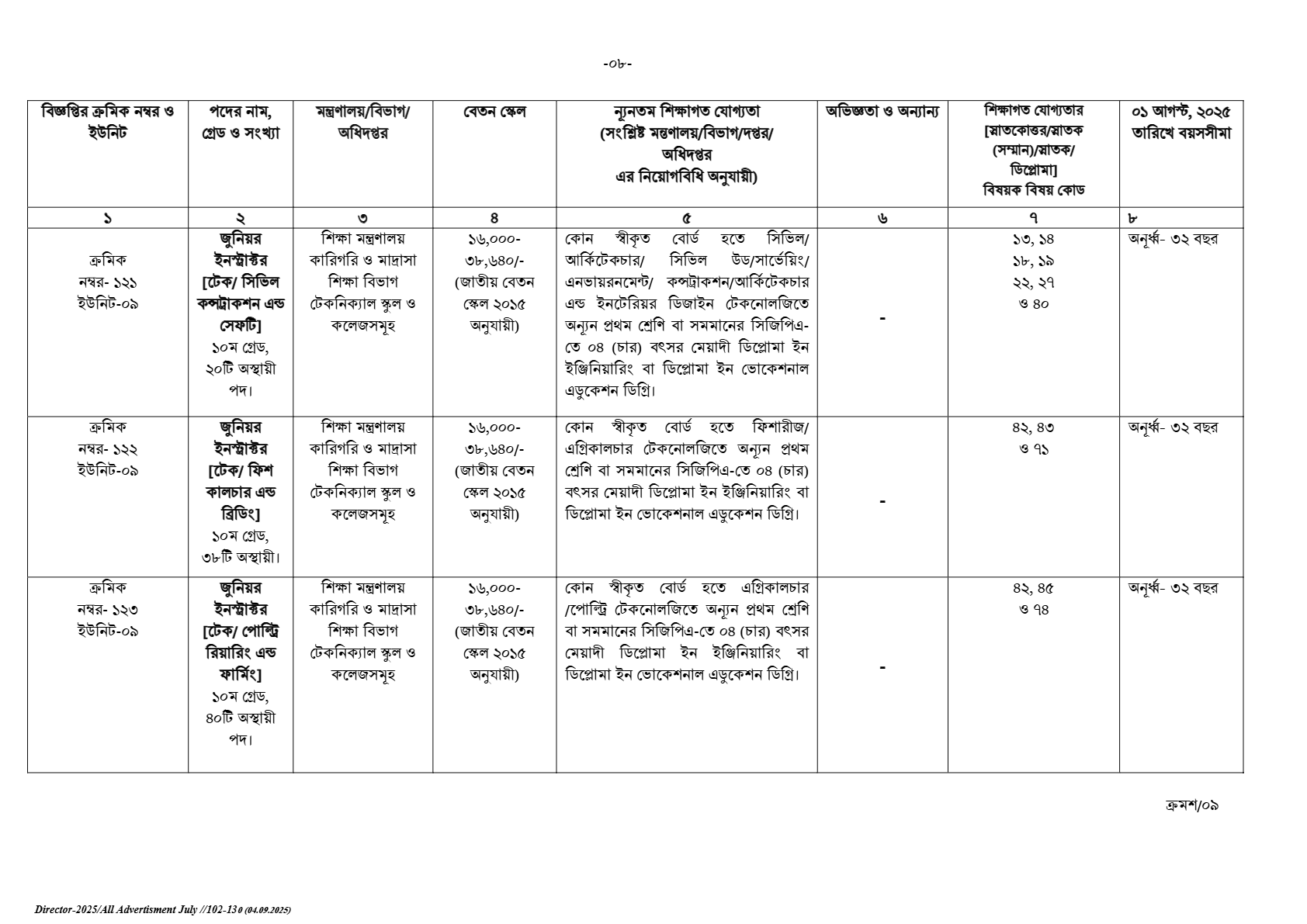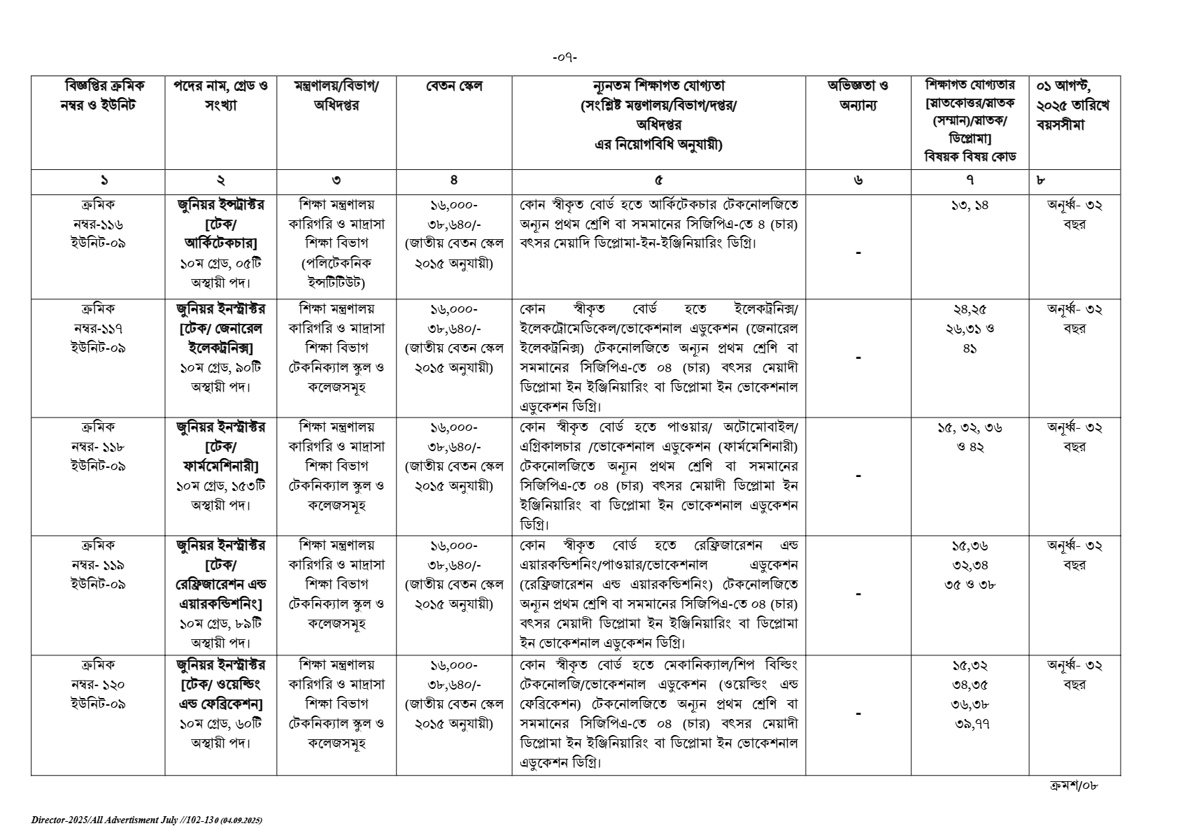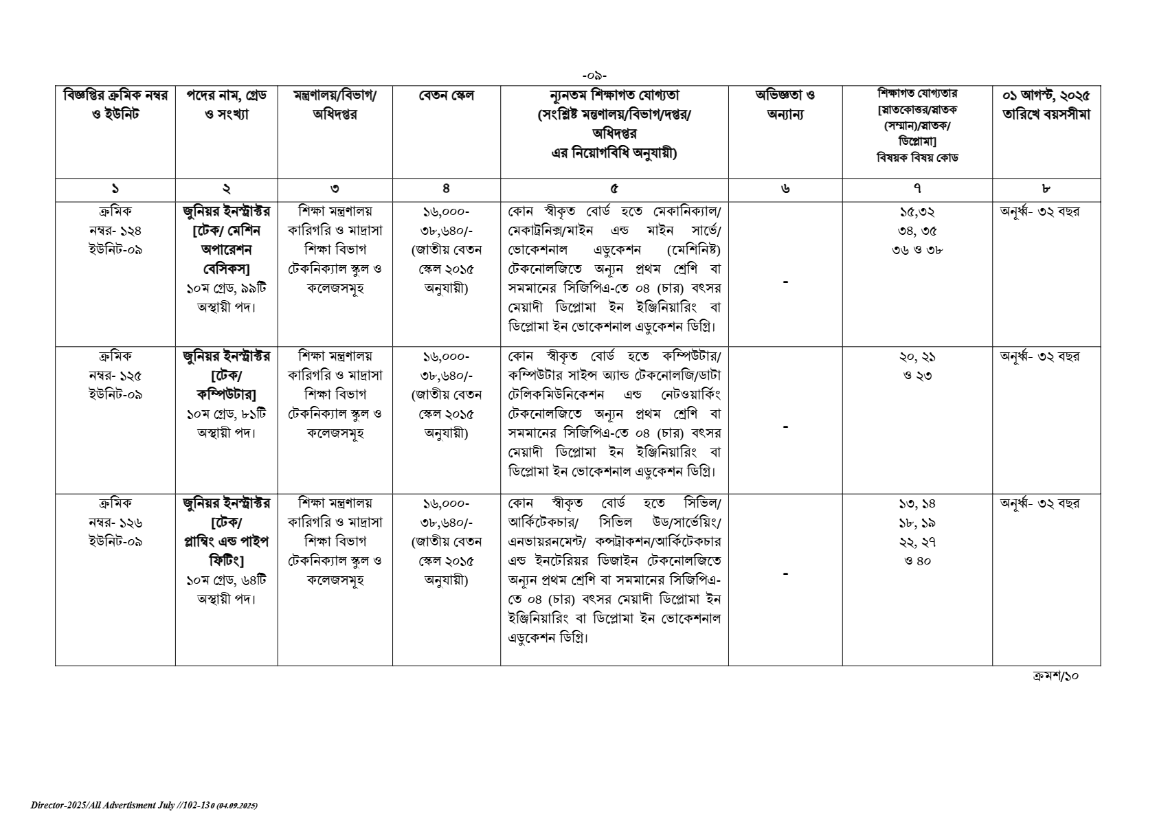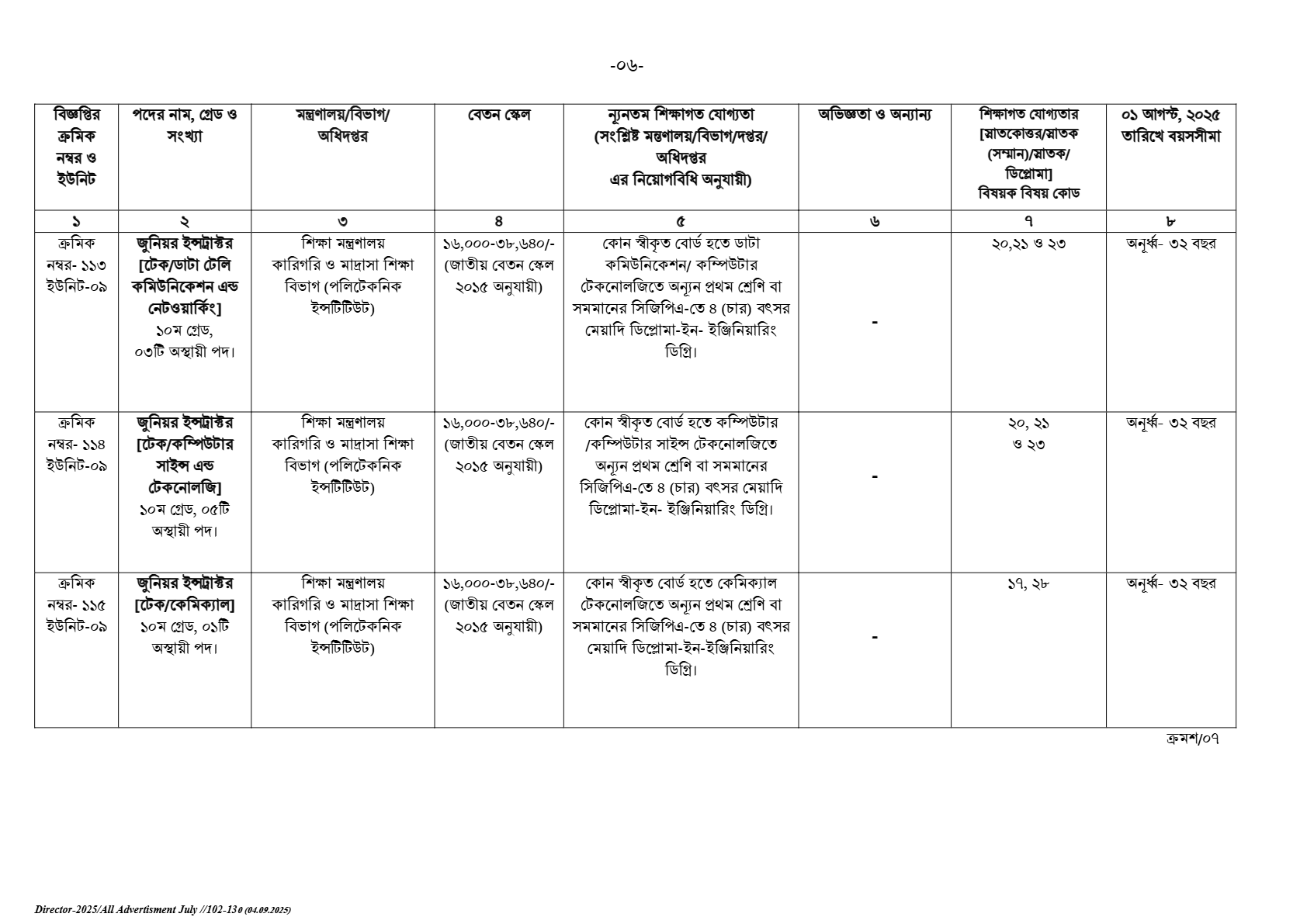 ১৬। জুনিয়র ইন্সট্রাক্টর (টেক/কম্পিউটার সাইন্স এন্ড টেকনোলজি) : ১০ম গ্রেড ৫টি অস্থায়ী পদ।