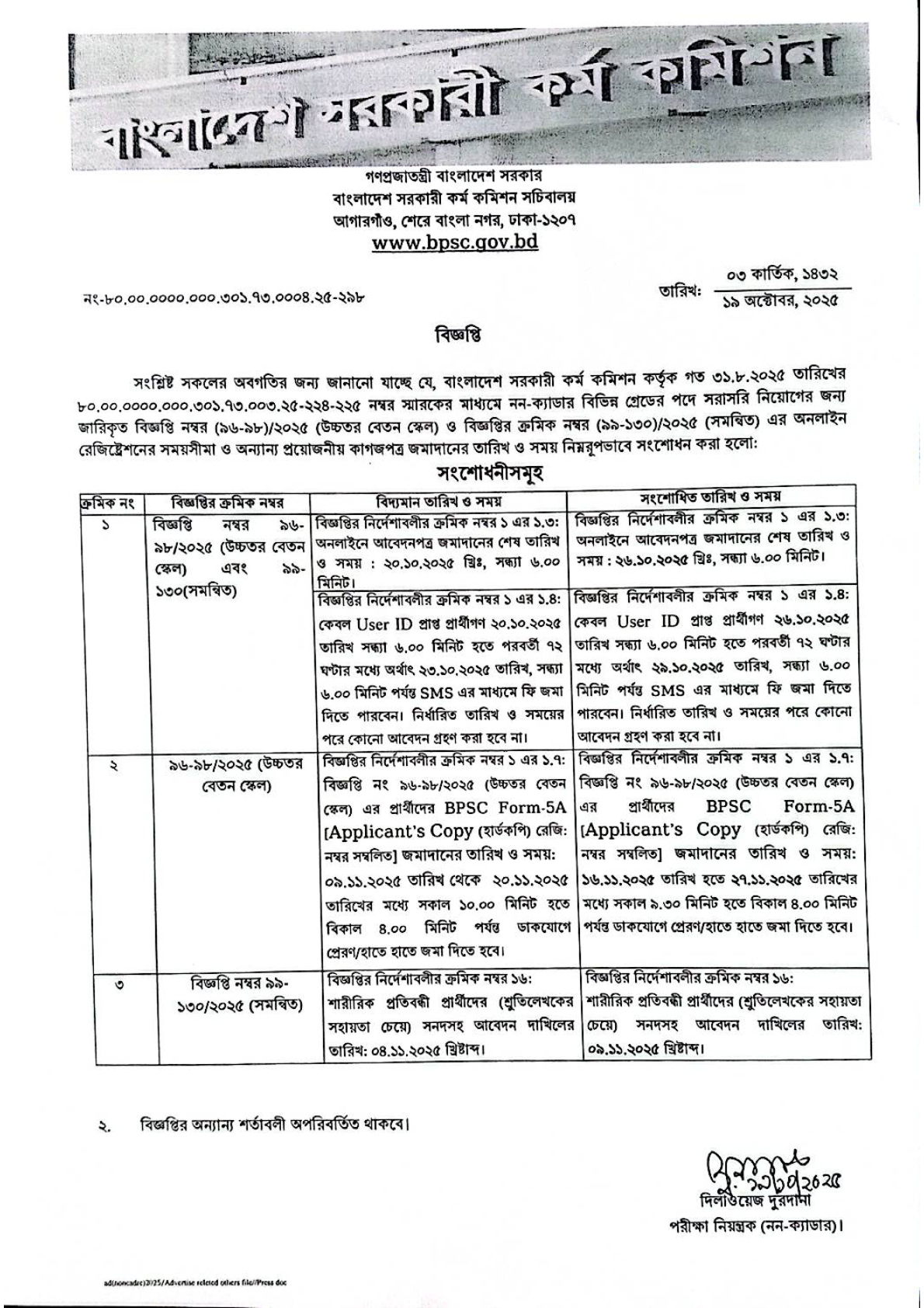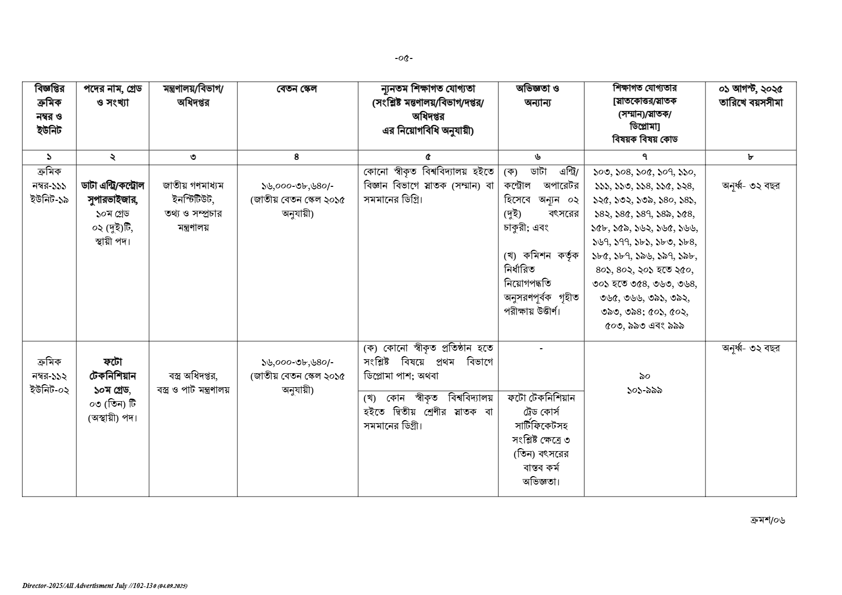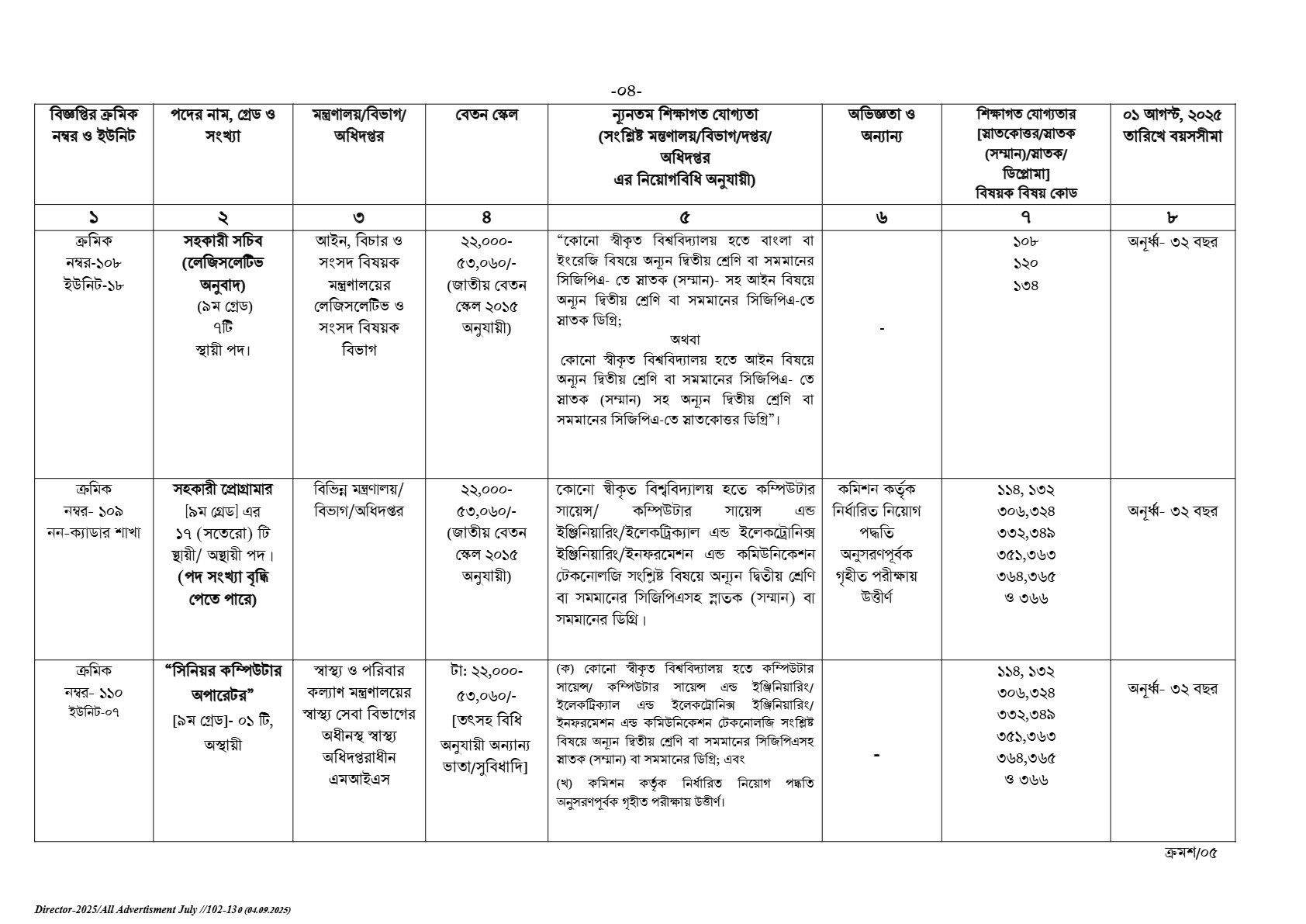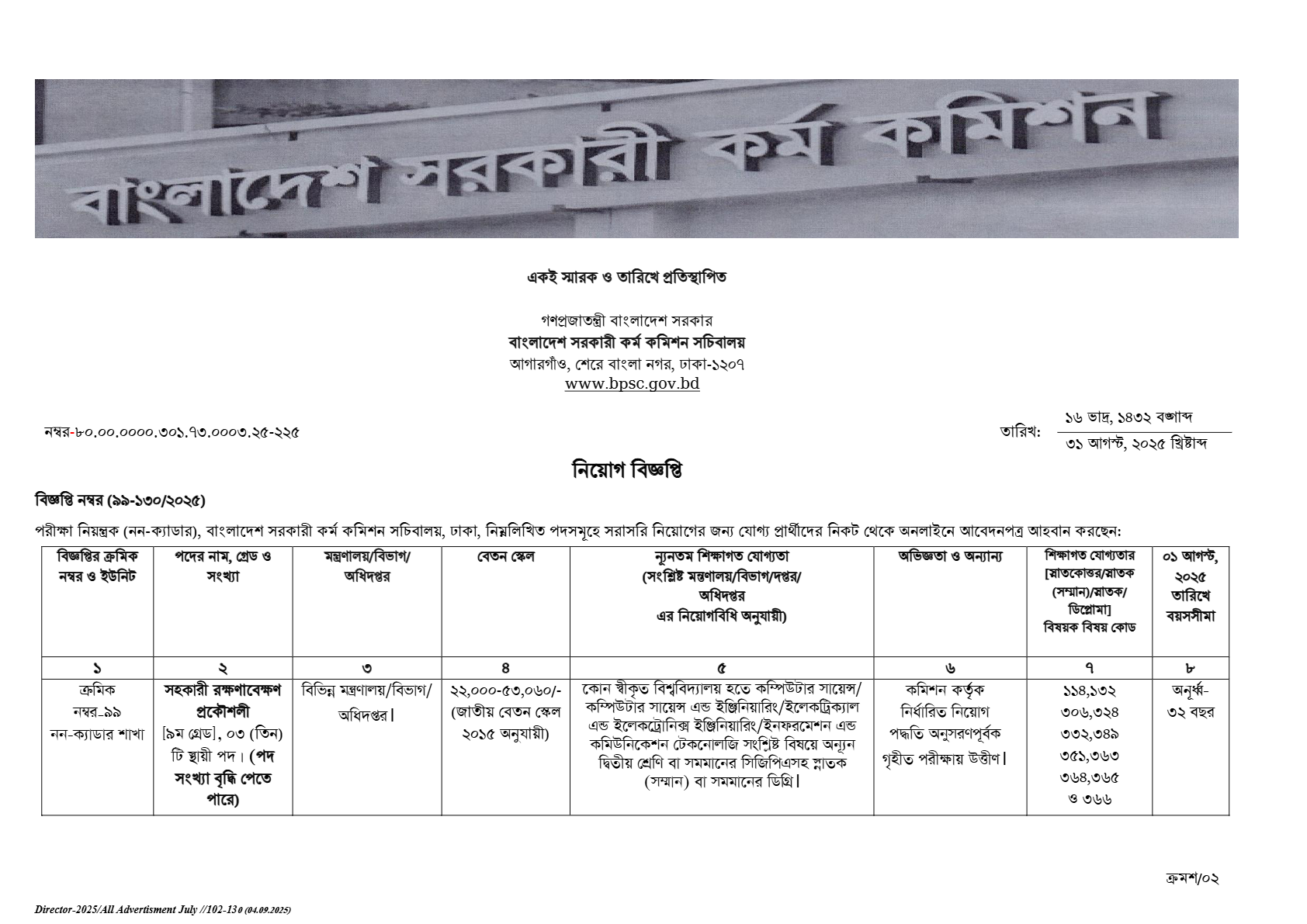 বাংলাদেশ সরকারী কর্ম কমিশন সচিবালয় কর্তৃক নন-ক্যাডার বিভিন্ন পদে নতুন নিয়োগ বিজ্ঞপ্তি প্রকাশিত হয়েছে। এই বিজ্ঞপ্তির মাধ্যমে ০১.০৮.২০২৫ তারিখে যোগ্য প্রার্থীদের কাছ থেকে অনলাইনে আবেদন আহ্বান করা হয়েছে।