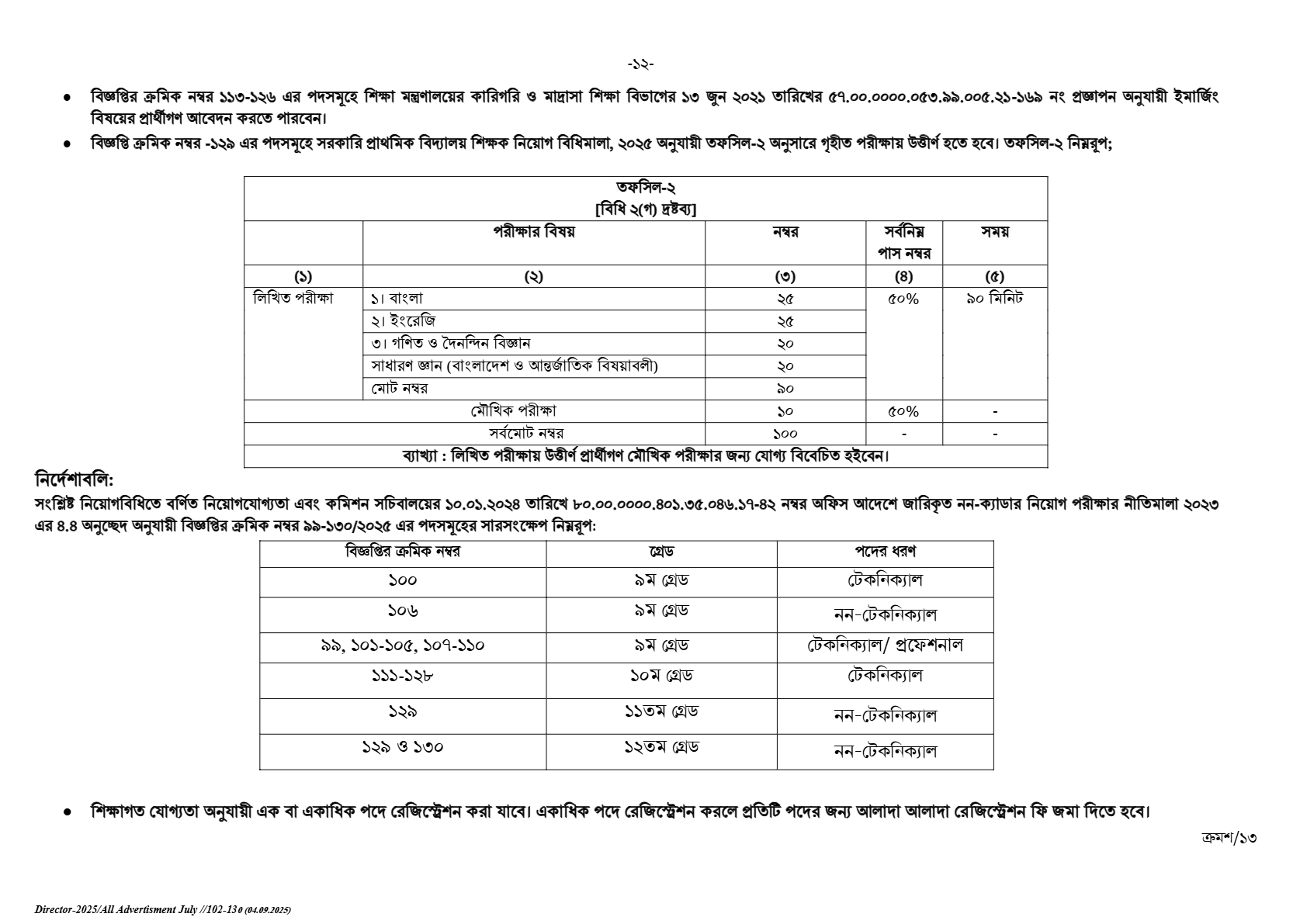৩১। প্রধান শিক্ষক : ১১তম ও ১২ তম গ্রেড ১১২২টি স্থায়ী পদ।