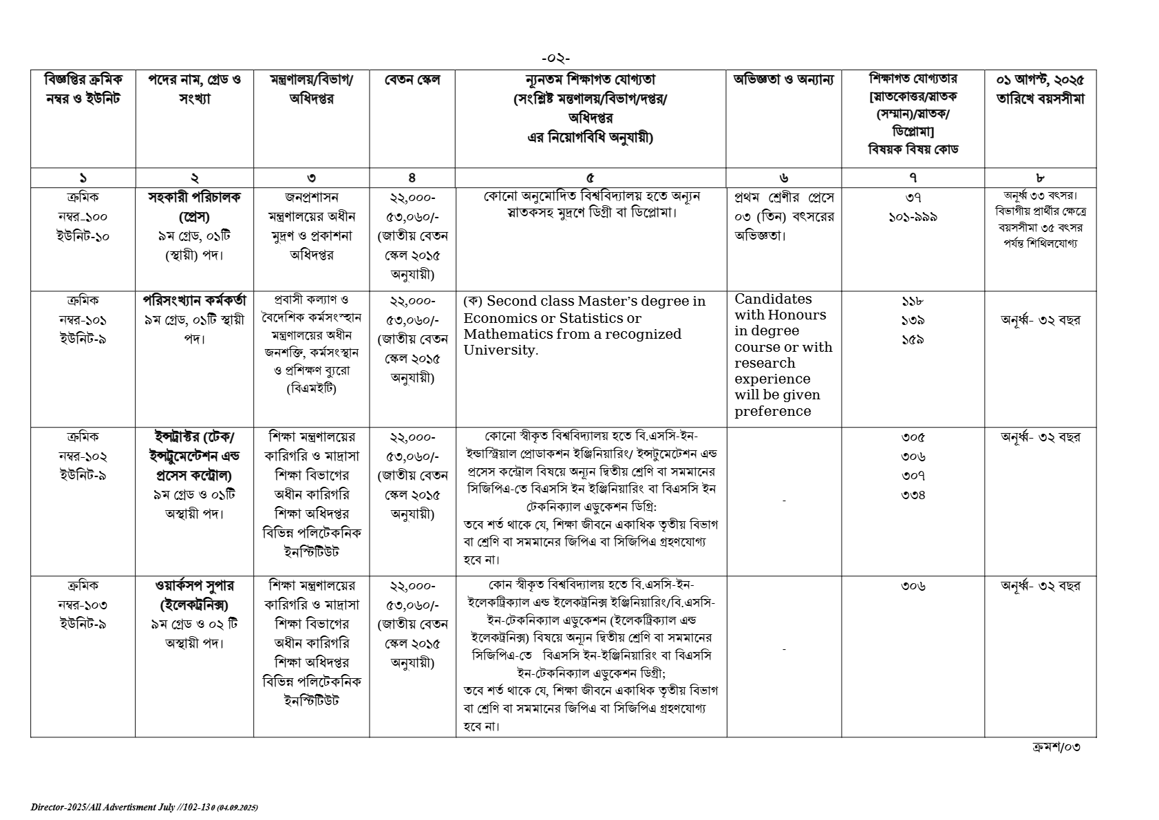 বয়সসীমা: ০১.০৮.২০২৫ তারিখে সাধারণ প্রার্থীদের ক্ষেত্রে অধিকাংশ পদের জন্য সর্বোচ্চ ৩২ বছর (নির্দিষ্ট কিছু পদের জন্য ৩০ বছর)। মুক্তিযোদ্ধা/শহীদ মুক্তিযোদ্ধার পুত্র/কন্যা এবং শারীরিক প্রতিবন্ধী প্রার্থীদের জন্য সর্বোচ্চ ৩২ বছর প্রযোজ্য।