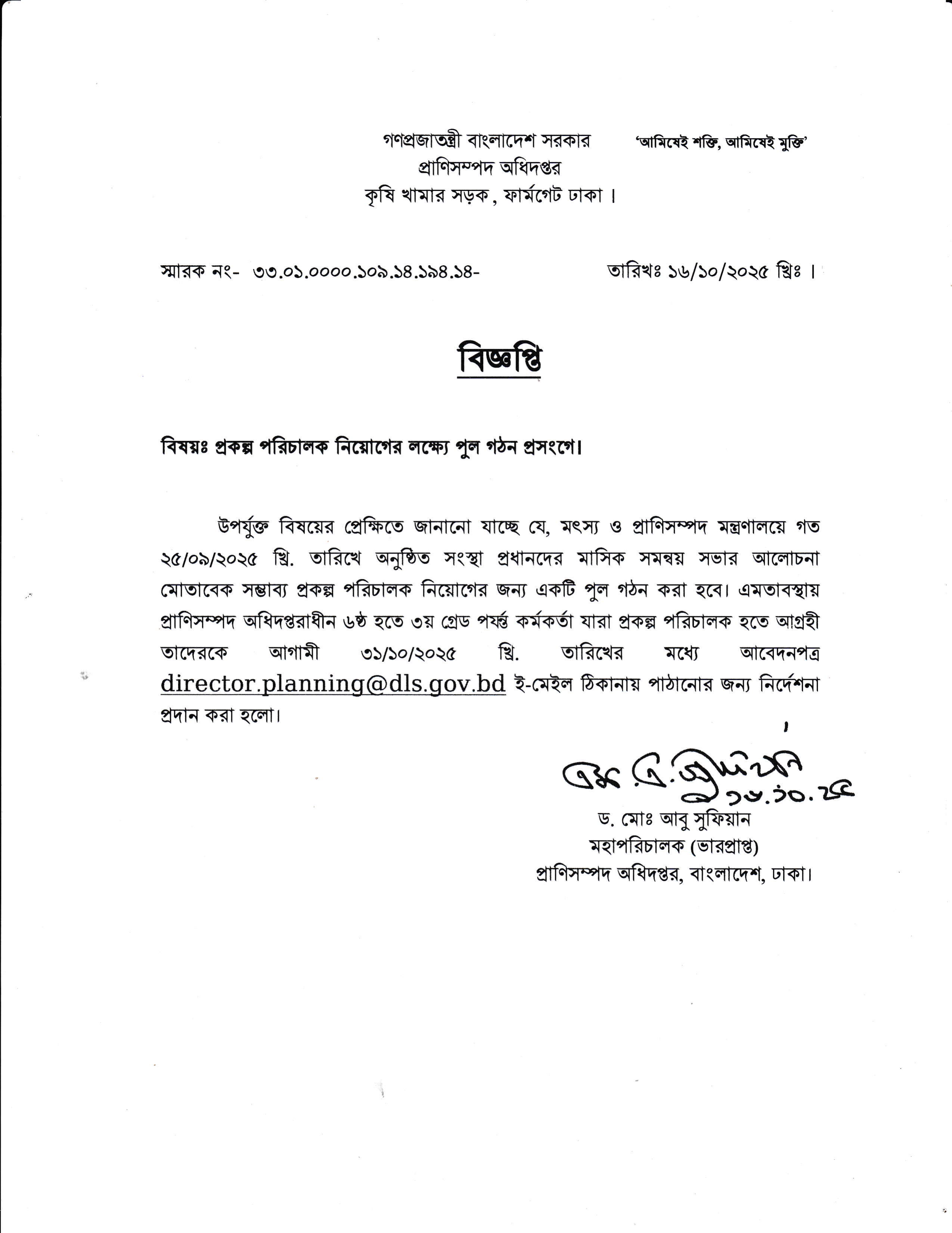 মৎস্য ও প্রাণিসম্পদ মন্ত্রণালয়ের মাসিক সমন্বয় সভার সিদ্ধান্ত অনুযায়ী, প্রাণিসম্পদ অধিদপ্তর প্রকল্প পরিচালক নিয়োগের লক্ষ্যে একটি পুল গঠনের জন্য আবেদন আহ্বান করেছে।