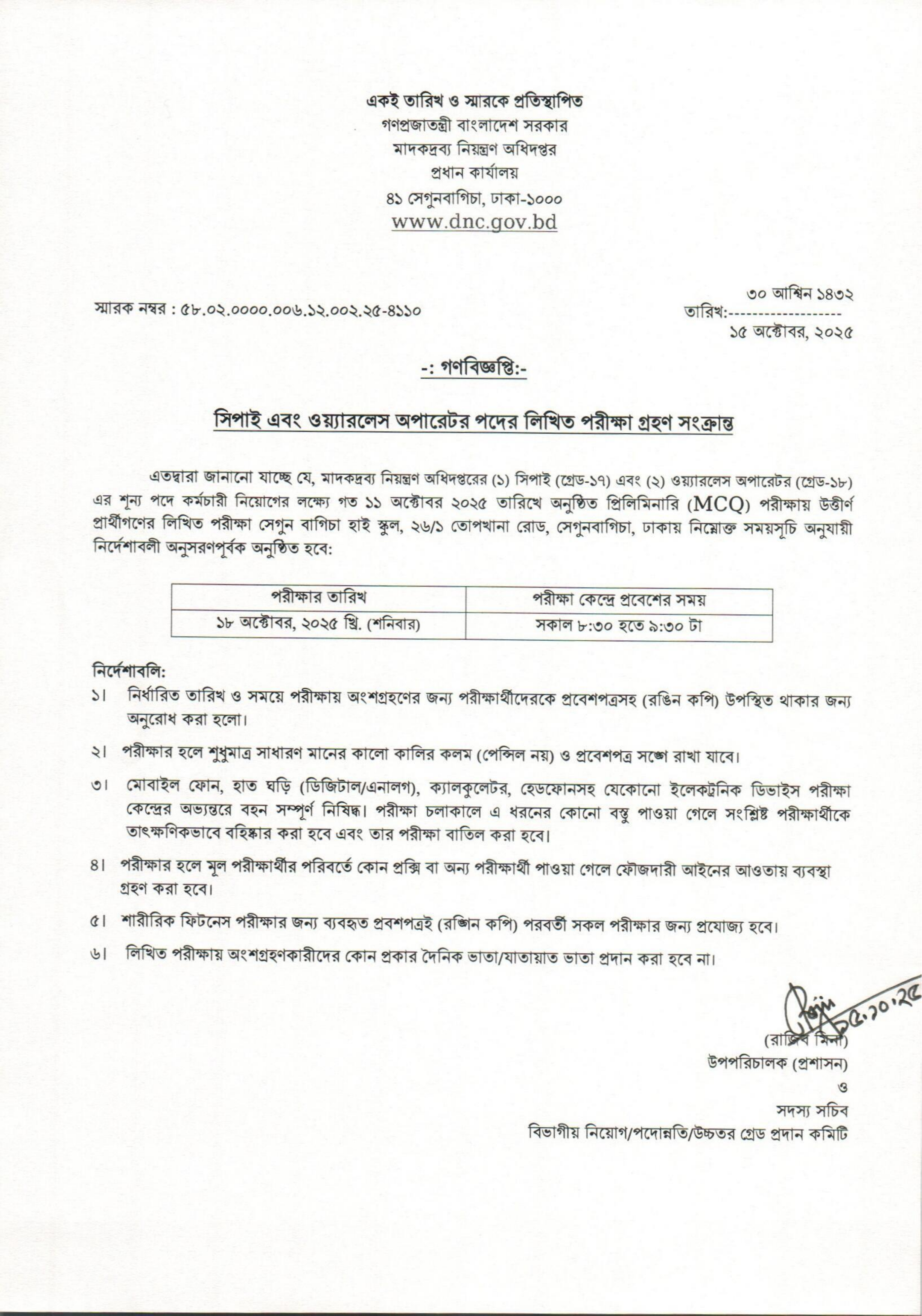 মাদকদ্রব্য নিয়ন্ত্রণ অধিদপ্তর কর্তৃক সিপাই (গ্রেড-১৭) এবং ওয়্যারলেস অপারেটর (গ্রেড-১৮) পদের লিখিত পরীক্ষা গ্রহণ সংক্রান্ত একটি গণবিজ্ঞপ্তি প্রকাশ করা হয়েছে। গত ১১ অক্টোবর ২০২৫ তারিখে অনুষ্ঠিত প্রিলিমিনারি পরীক্ষায় উত্তীর্ণ প্রার্থীদের লিখিত পরীক্ষা অনুষ্ঠিত হবে।