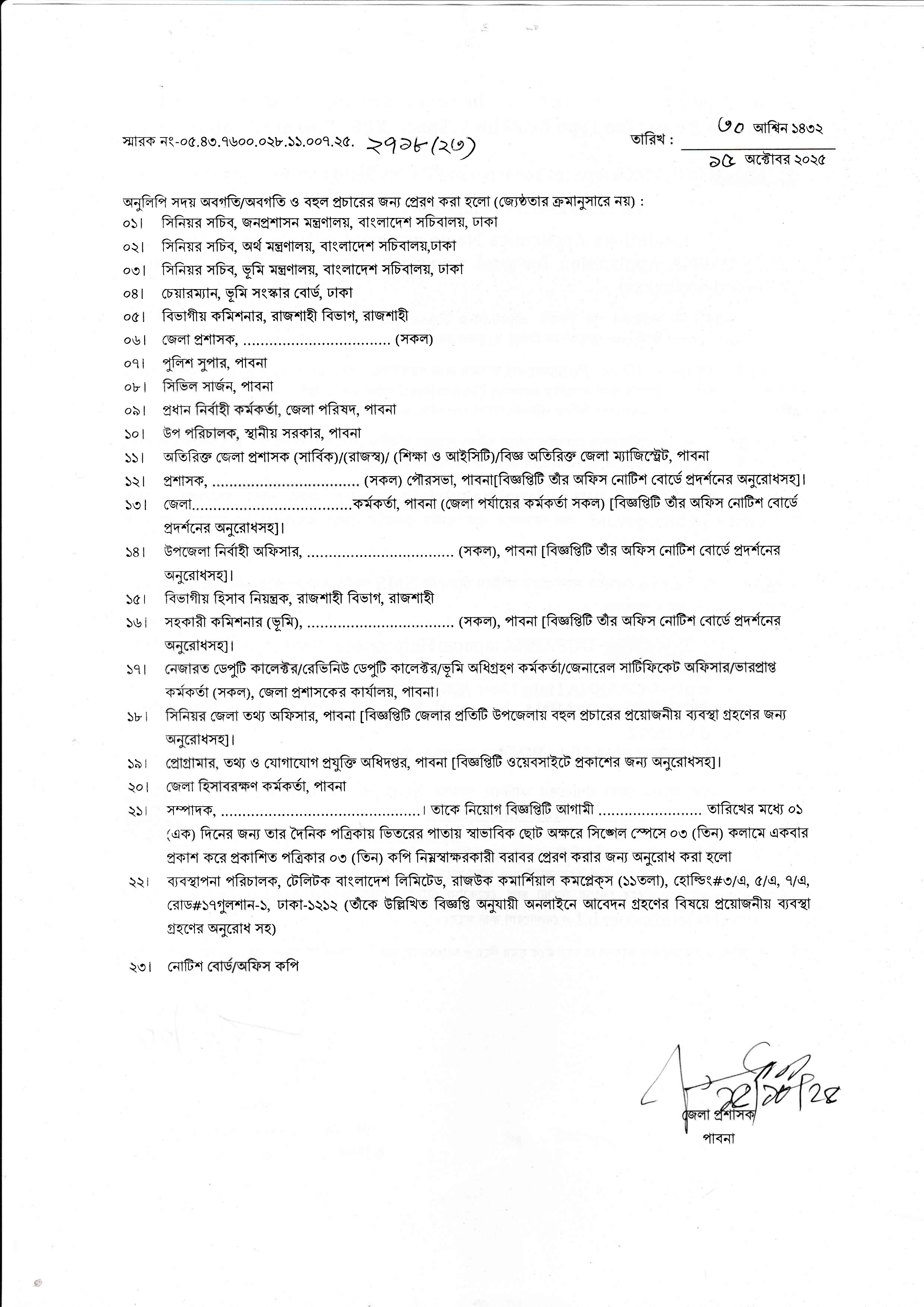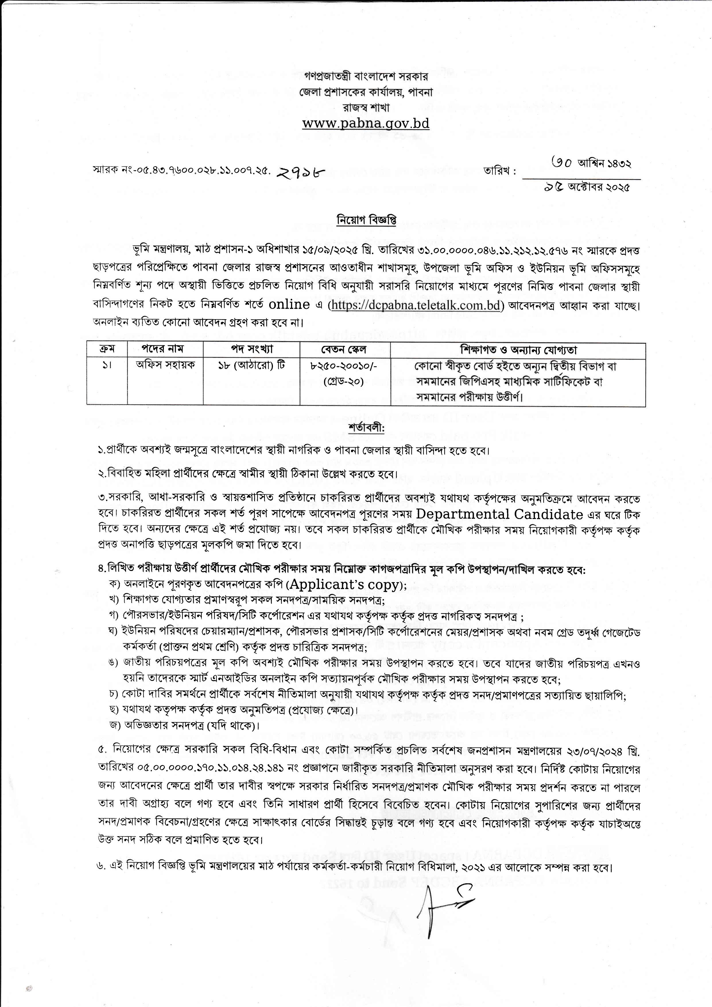 পরীক্ষার তারিখ, সময় ও স্থান: পরীক্ষার তারিখ, সময় ও স্থান পরবর্তীতে জেলা প্রশাসকের কার্যালয়, পাবনা’র ওয়েবসাইট (www.pabna.gov.bd) এবং প্রার্থীর মোবাইল ফোনে SMS এর মাধ্যমে জানানো হবে।
