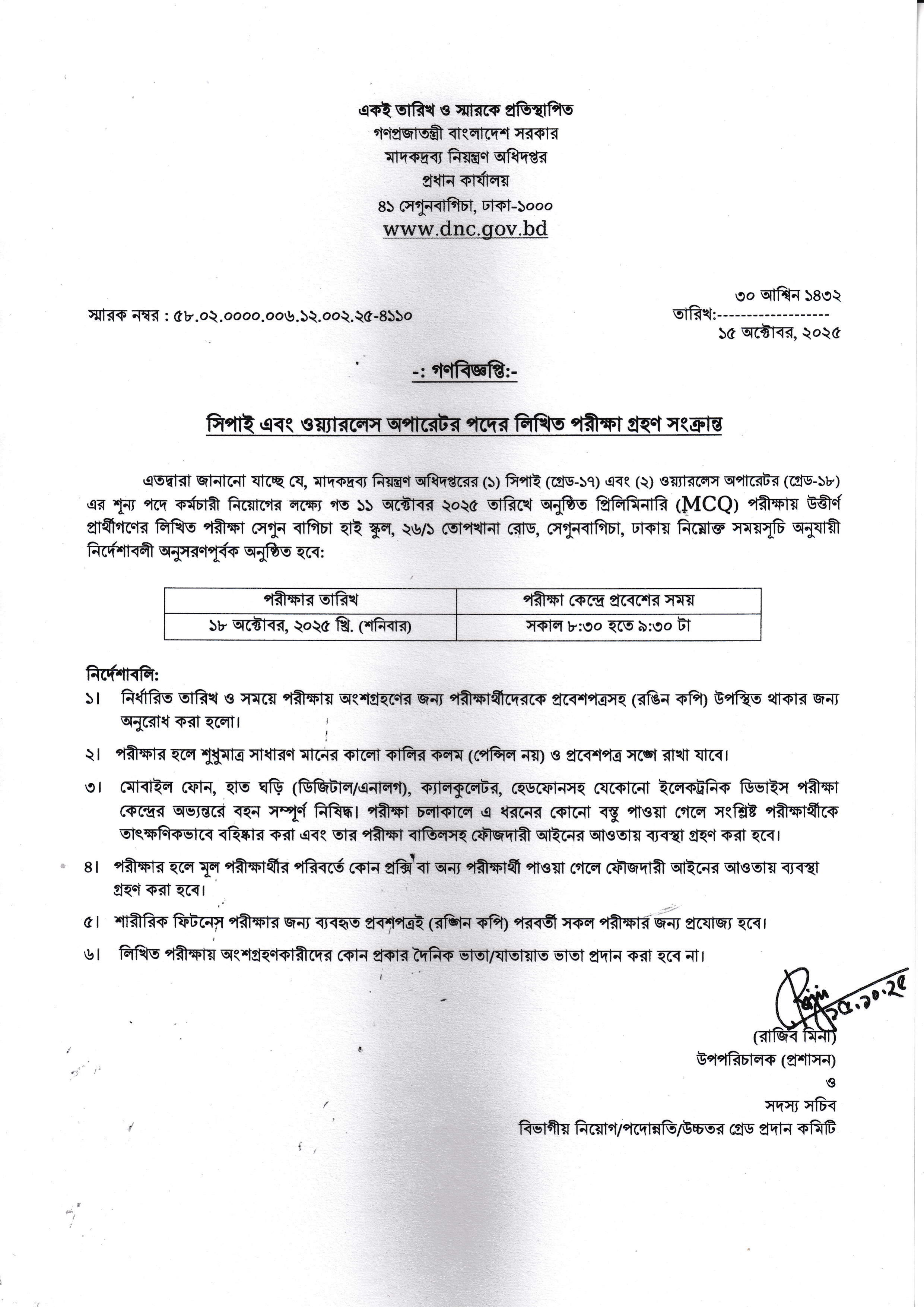 মাদকদ্রব্য নিয়ন্ত্রণ অধিদপ্তরের (DNC) সিপাই (গ্রেড-১৭) এবং ওয়্যারলেস অপারেটর (গ্রেড-১৮) পদের শূন্য পদে জনবল নিয়োগের লক্ষ্যে অনুষ্ঠিত প্রিলিমিনারি পরীক্ষায় উত্তীর্ণ প্রার্থীদের লিখিত পরীক্ষা গ্রহণ সংক্রান্ত একটি গণবিজ্ঞপ্তি প্রকাশ করা হয়েছে।