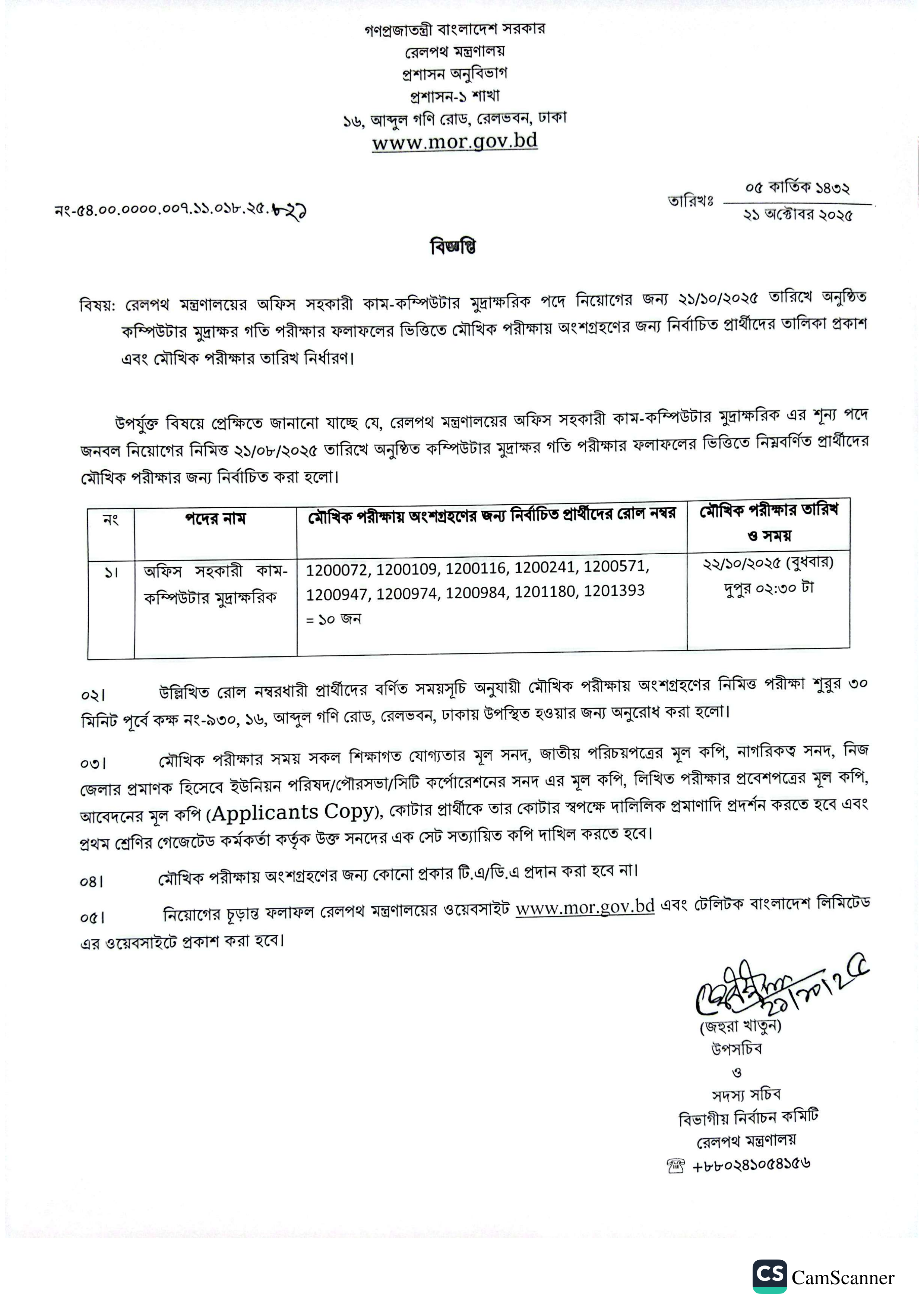 নির্বাচিত প্রার্থীদের মৌখিক পরীক্ষা ২২ অক্টোবর ২০২৫ তারিখ (বুধবার) দুপুর ০২:৩০ টায় অনুষ্ঠিত হবে। প্রার্থীদের কক্ষ নং-৯৩০, ১৬, আব্দুল গণি রোড, রেলভবন, ঢাকা-এ পরীক্ষা শুরুর ৩০ মিনিট পূর্বে উপস্থিত থাকতে অনুরোধ করা হয়েছে।