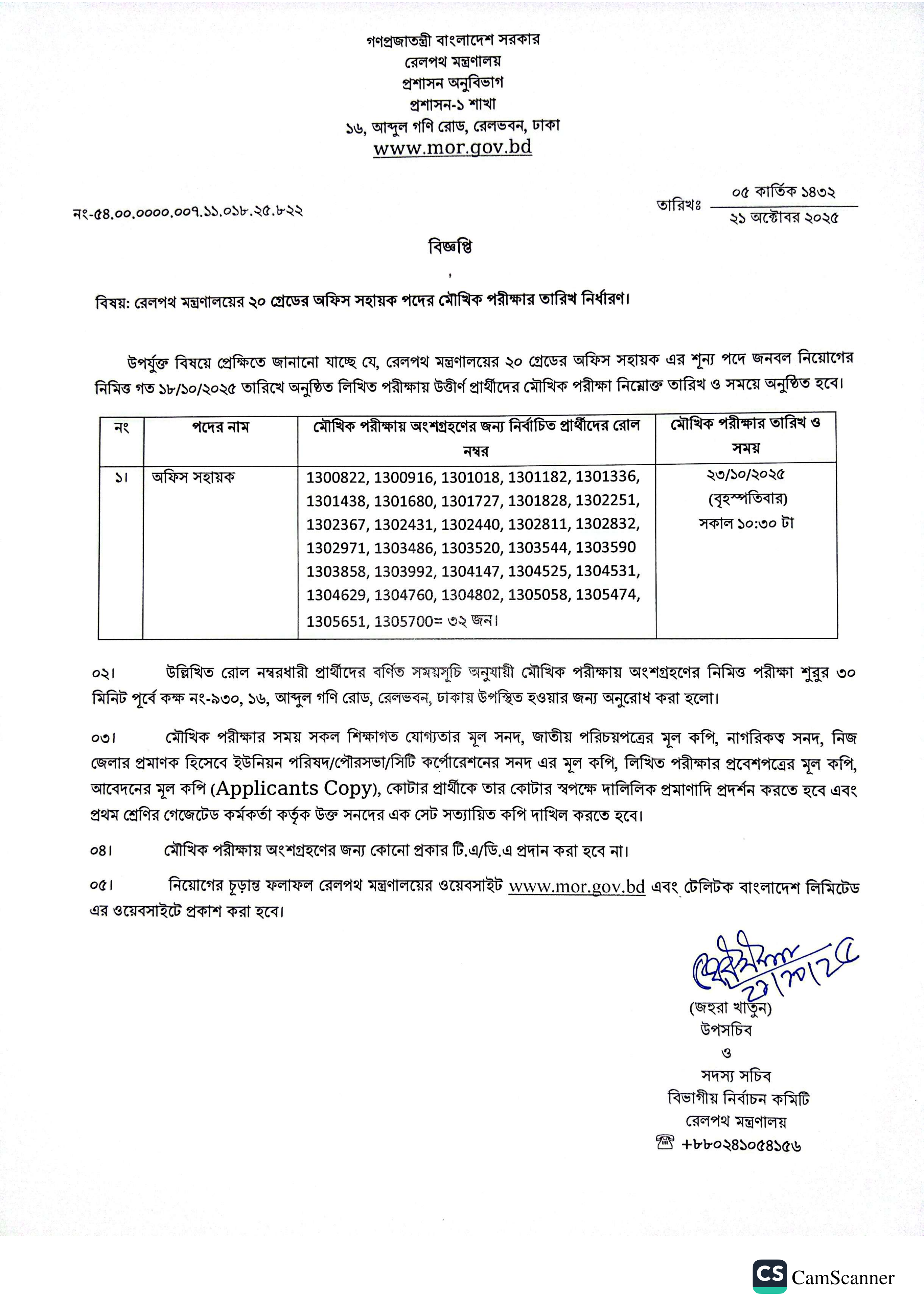 রেলপথ মন্ত্রণালয়ের ২০ গ্রেডের অফিস সহায়ক পদে জনবল নিয়োগের জন্য গত ১৮/১০/২০২৫ তারিখে অনুষ্ঠিত লিখিত পরীক্ষায় উত্তীর্ণ প্রার্থীদের মৌখিক পরীক্ষার তারিখ ঘোষণা করা হয়েছে।