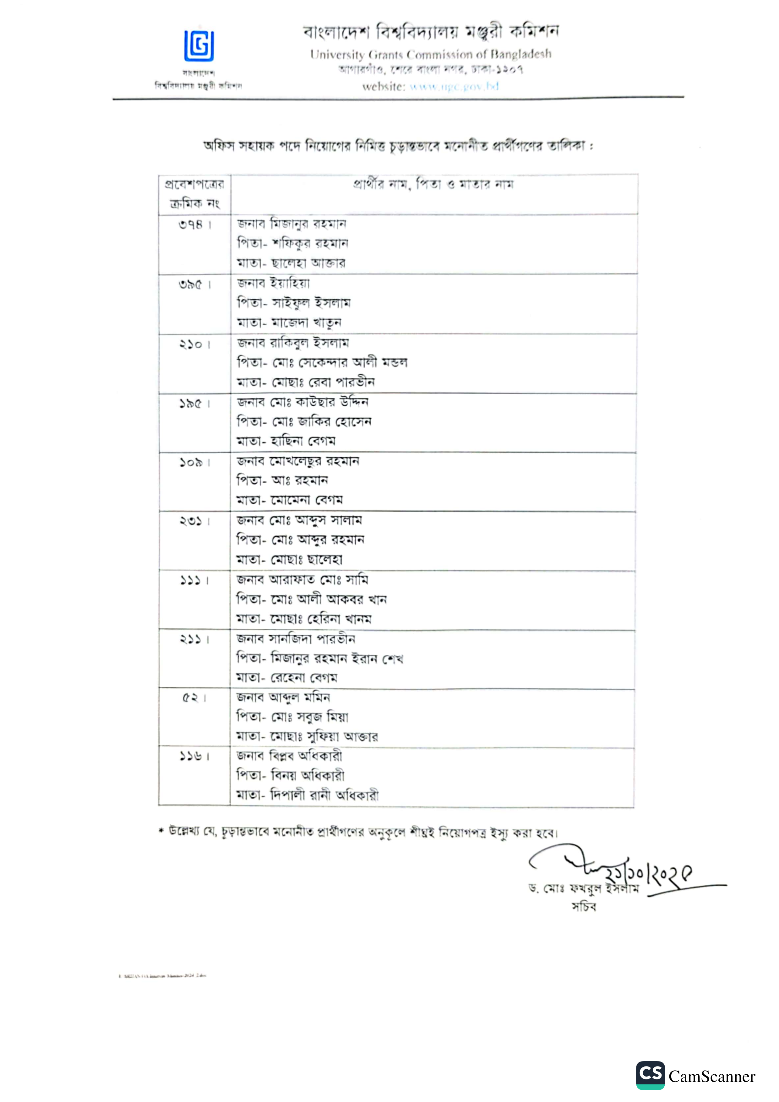 বাংলাদেশ বিশ্ববিদ্যালয় মঞ্জুরী কমিশন (ইউজিসি) কর্তৃক “অফিস সহায়ক” পদে নিয়োগের জন্য চূড়ান্তভাবে মনোনীত প্রার্থীদের তালিকা প্রকাশ করা হয়েছে।
