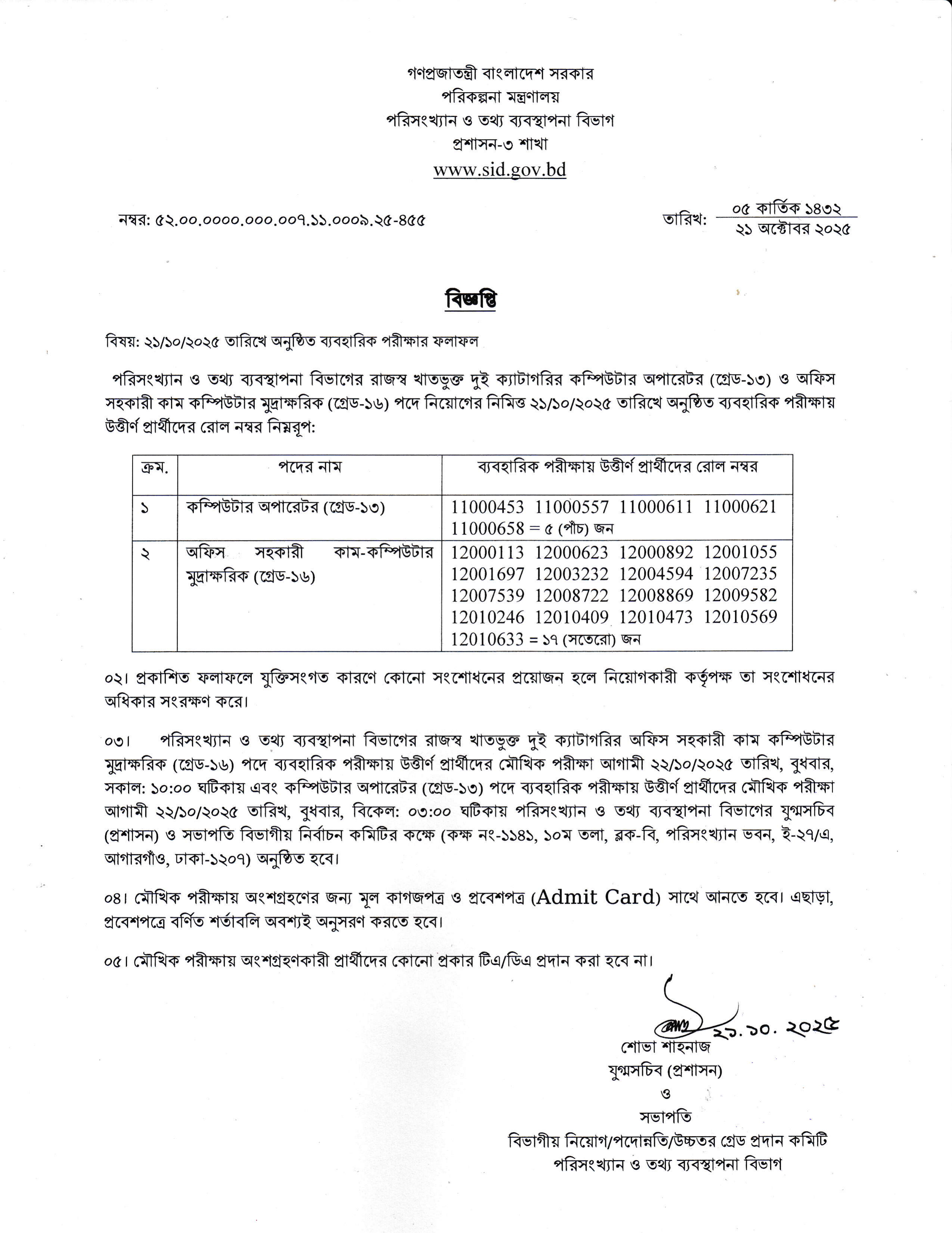 পরিকল্পনা মন্ত্রণালয়ের অধীন পরিসংখ্যান ও তথ্য ব্যবস্থাপনা বিভাগের রাজস্ব খাতভুক্ত কম্পিউটার অপারেটর (গ্রেড-১৩) এবং অফিস সহকারী কাম কম্পিউটার মুদ্রাক্ষরিক (গ্রেড-১৬) পদের ব্যবহারিক পরীক্ষার ফলাফল প্রকাশিত হয়েছে।