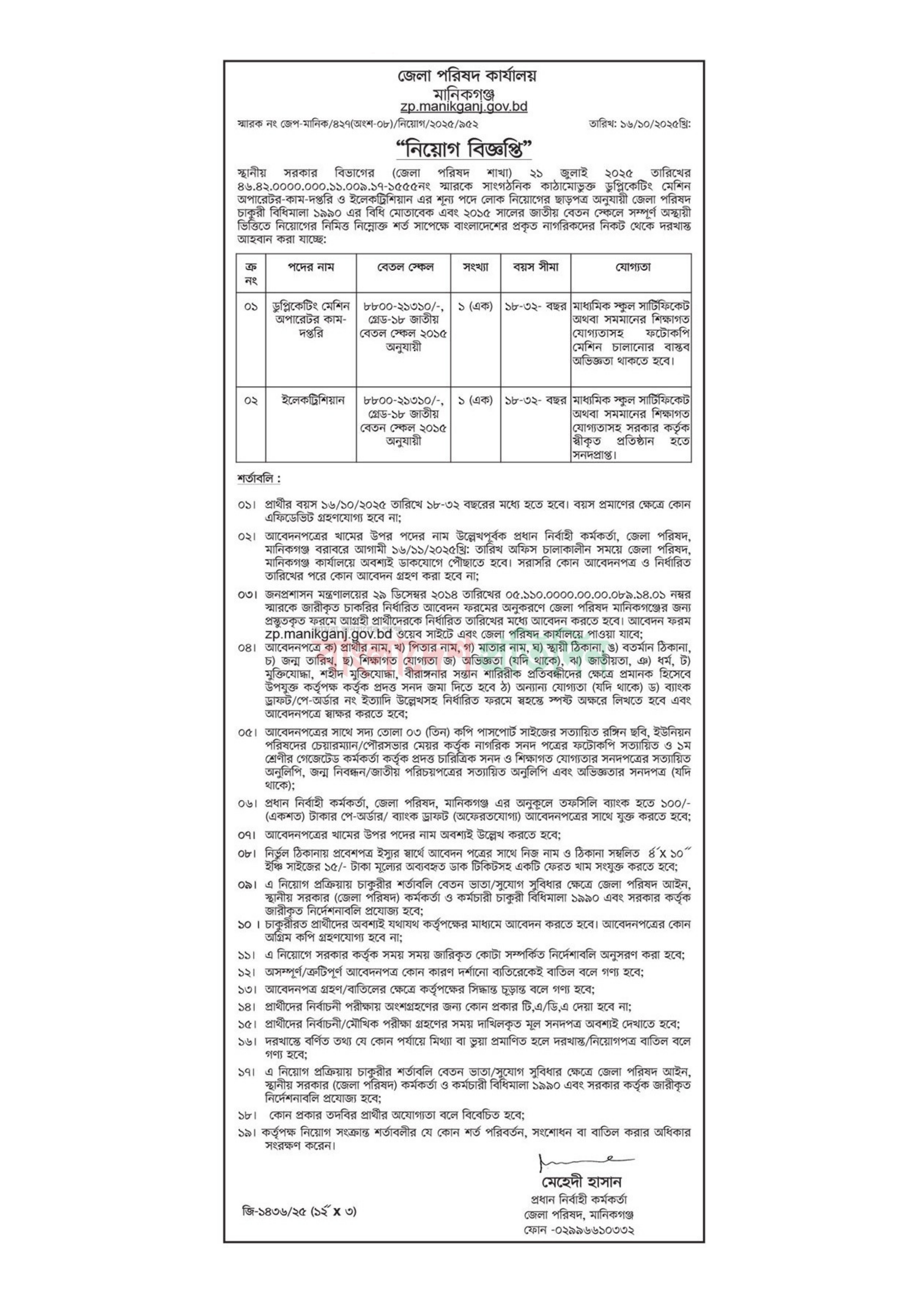 মানিকগঞ্জ জেলা পরিষদ কার্যালয়ে ডুপ্লিকেটিং মেশিন অপারেটর-কাম-দপ্তরি পদে ১ (এক) জন এবং ইলেকট্রিশিয়ান পদে ১ (এক) জনসহ মোট ২ (দুই) জন জনবল নিয়োগের জন্য একটি নতুন বিজ্ঞপ্তি প্রকাশ করা হয়েছে।