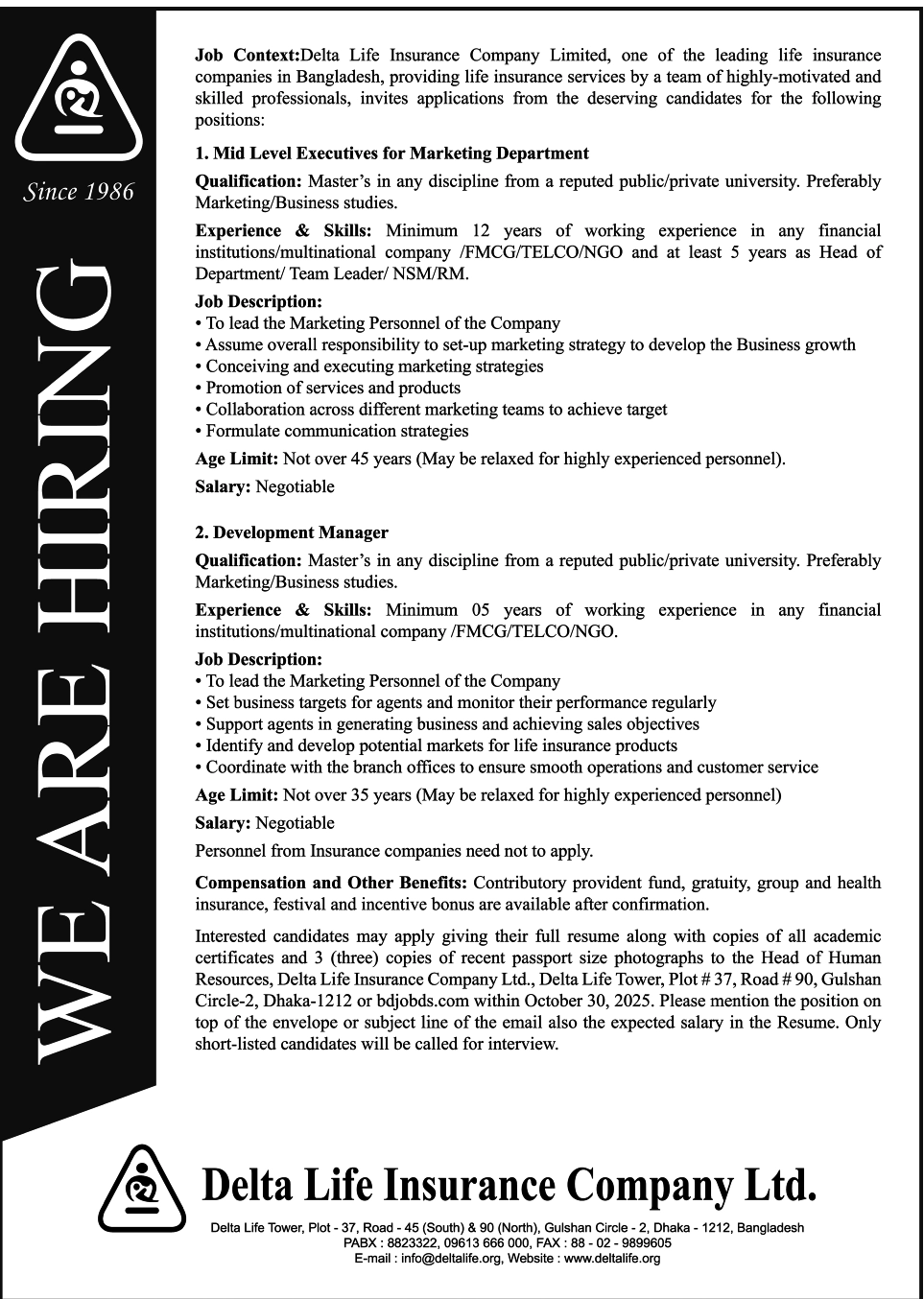 বাংলাদেশের অন্যতম শীর্ষস্থানীয় জীবন বীমা সেবাদাতা প্রতিষ্ঠান ডেল্টা লাইফ ইন্স্যুরেন্স কোম্পানি লিমিটেড, অত্যন্ত যোগ্য ও পেশাদার কর্মীদের সমন্বয়ে গঠিত একটি দল দ্বারা জীবন বীমা পরিষেবা প্রদান করে। তারা নিম্নলিখিত পদে যোগ্য প্রার্থীদের কাছ থেকে আবেদন আহ্বান করছে: