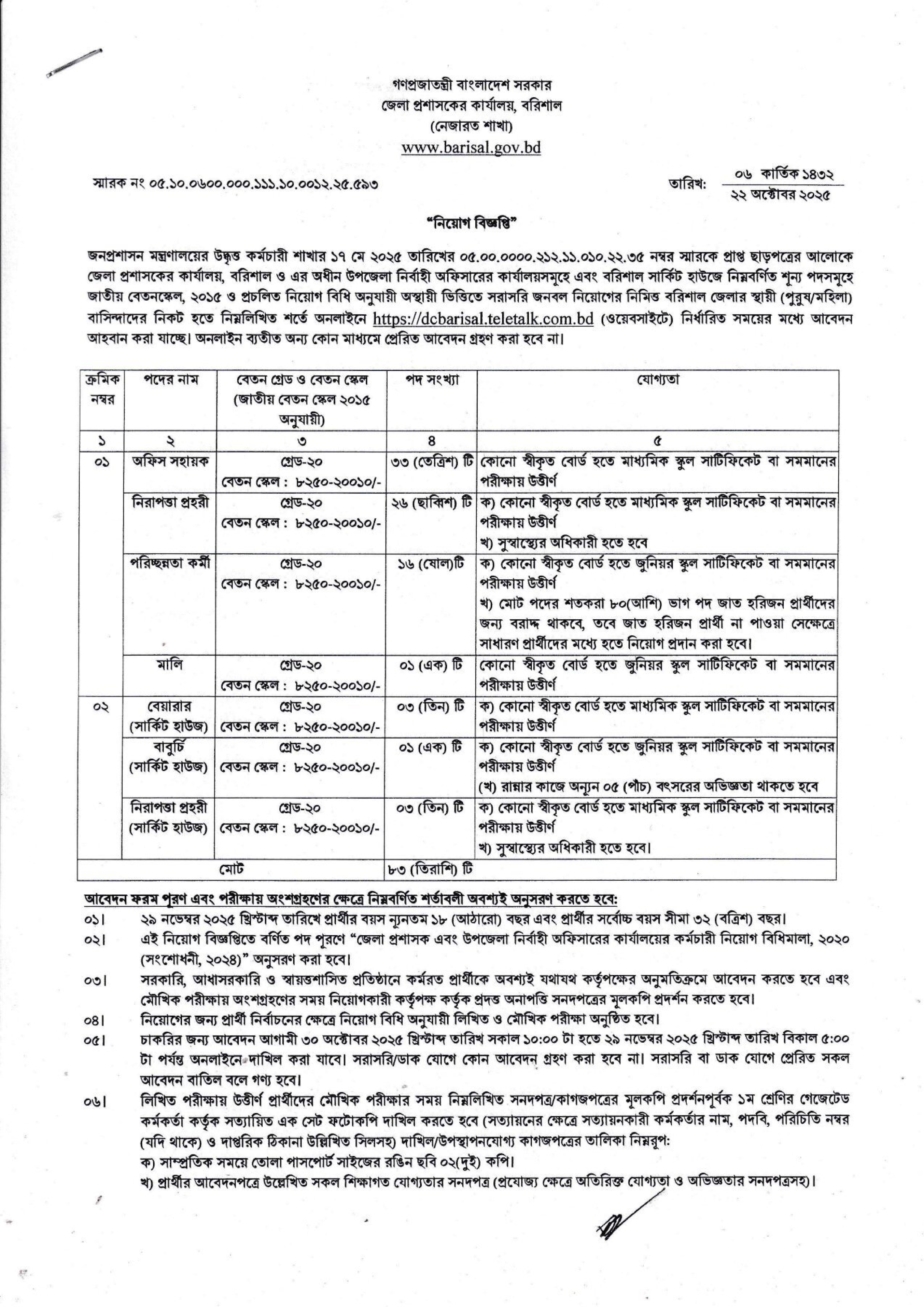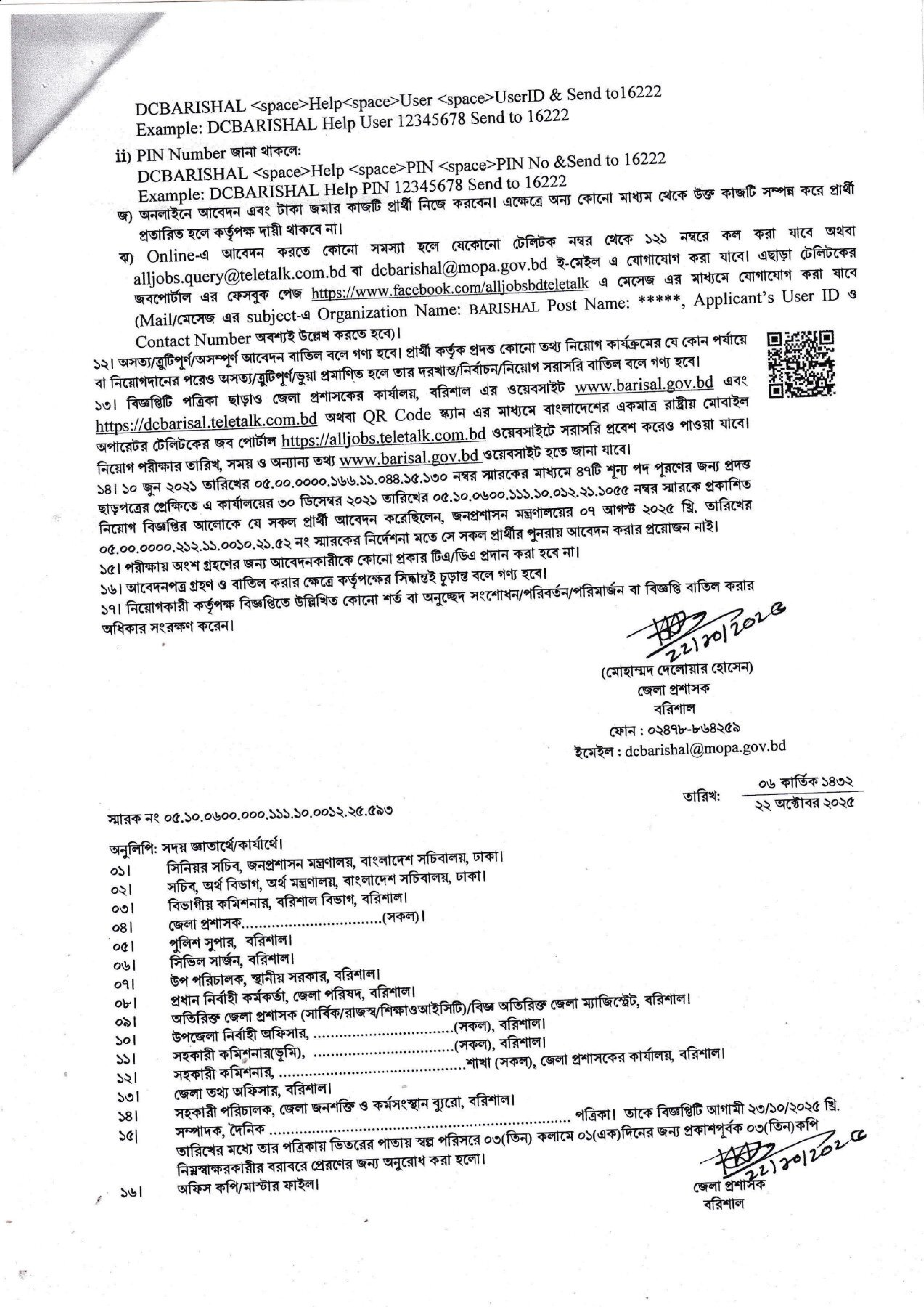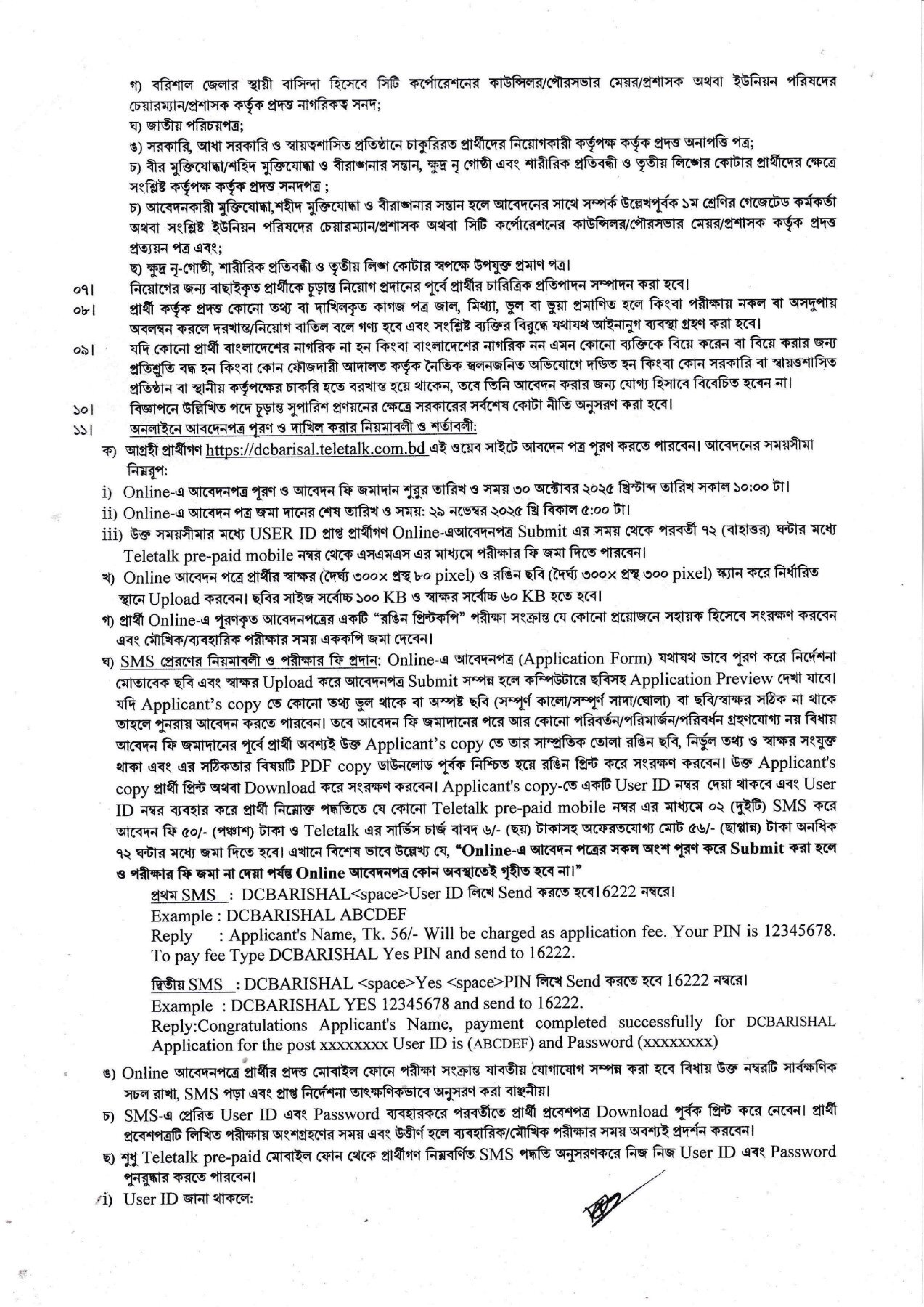 আবেদনের প্রক্রিয়া: আবেদন শুধুমাত্র অনলাইনে http://dcbarisal.teletalk.com.bd ওয়েবসাইটের মাধ্যমে করতে হবে। অনলাইন ব্যতীত অন্য কোনো মাধ্যমে প্রেরিত আবেদন গ্রহণ করা হবে না।