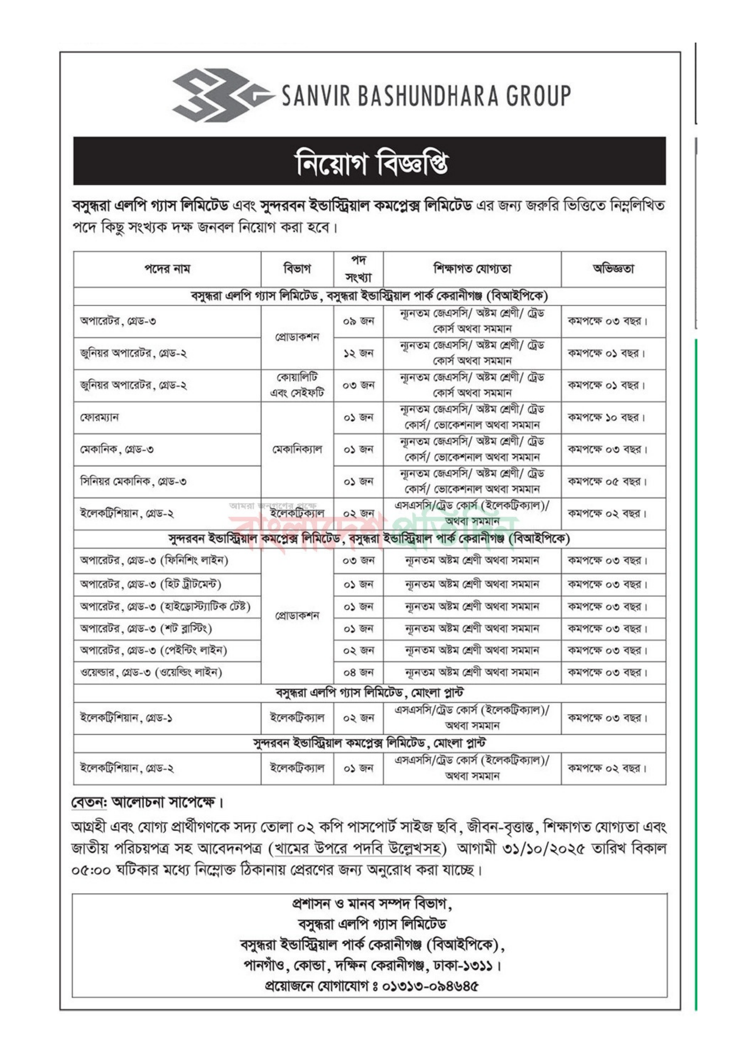 বসুন্ধরা এলপি গ্যাস লিমিটেড এবং সুন্দরবন ইন্ডাস্ট্রিয়াল কমপ্লেক্স লিমিটেড-এর জন্য জরুরি ভিত্তিতে কিছু সংখ্যক দক্ষ জনবল নিয়োগ করা হবে।