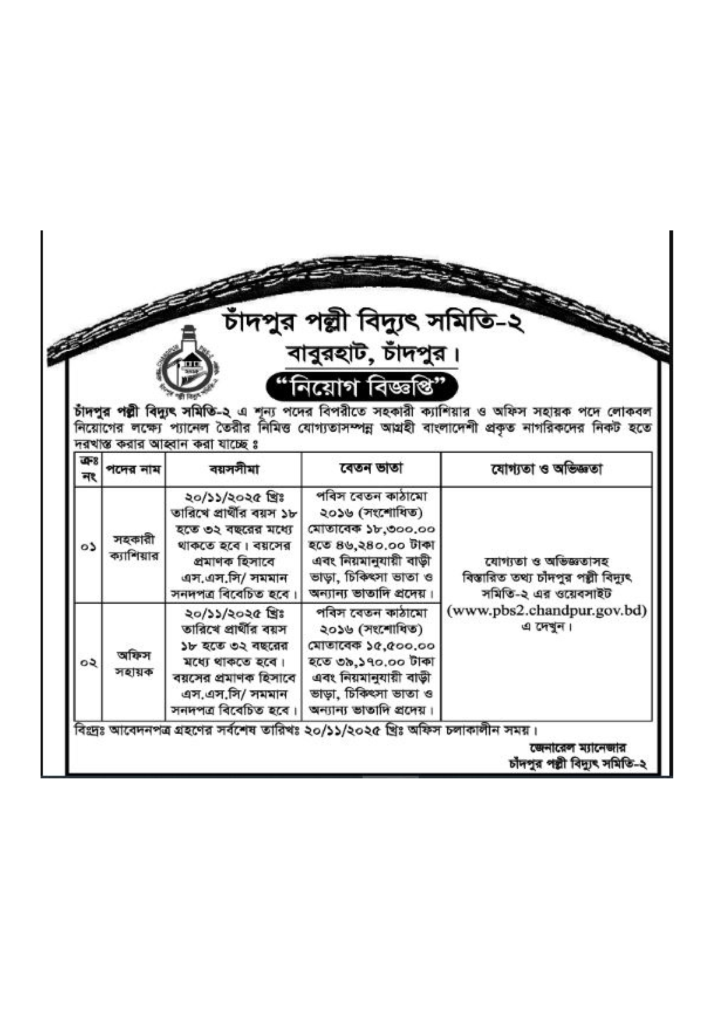 চাঁদপুর পল্লী বিদ্যুৎ সমিতি-২ এর নতুন নিয়োগ বিজ্ঞপ্তি প্রকাশ