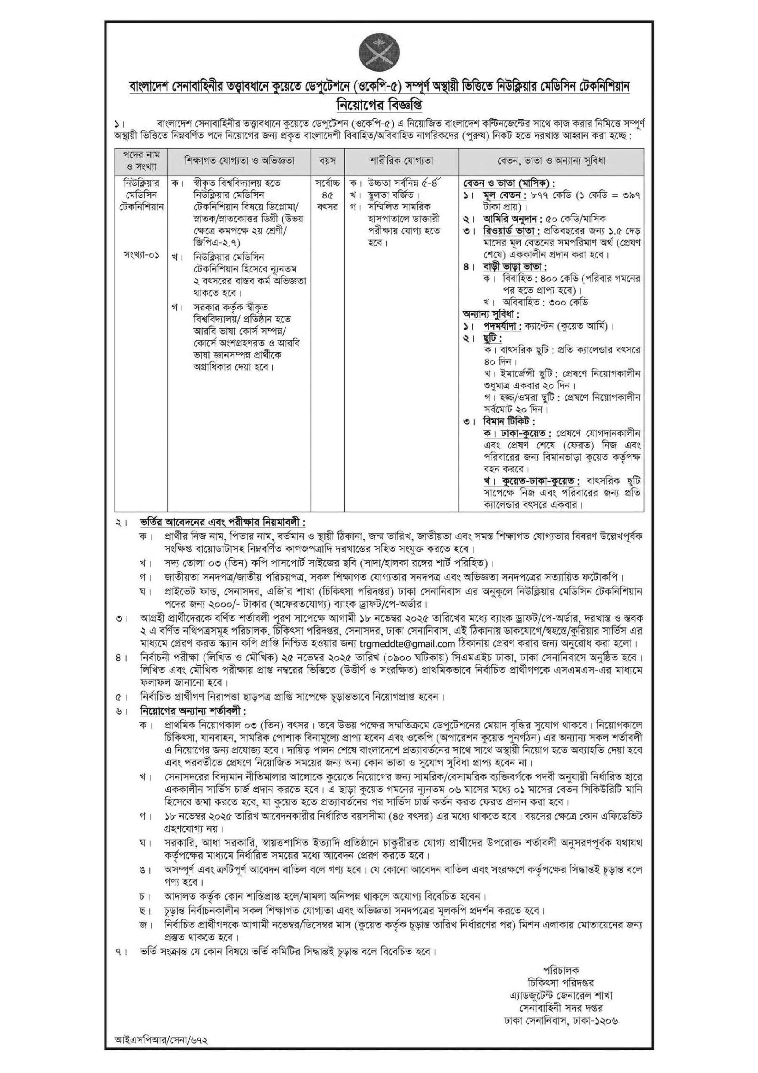 বাংলাদেশ সেনাবাহিনী কর্তৃক কুয়েতে ডেপুটেশনের (প্রেষণ) ভিত্তিতে নিউক্লিয়ার মেডিসিন টেকনিশিয়ান পদে নিয়োগের জন্য প্রকৃত বাংলাদেশী নাগরিকদের (পুরুষ) নিকট হতে দরখাস্ত আহ্বান করা হচ্ছে।