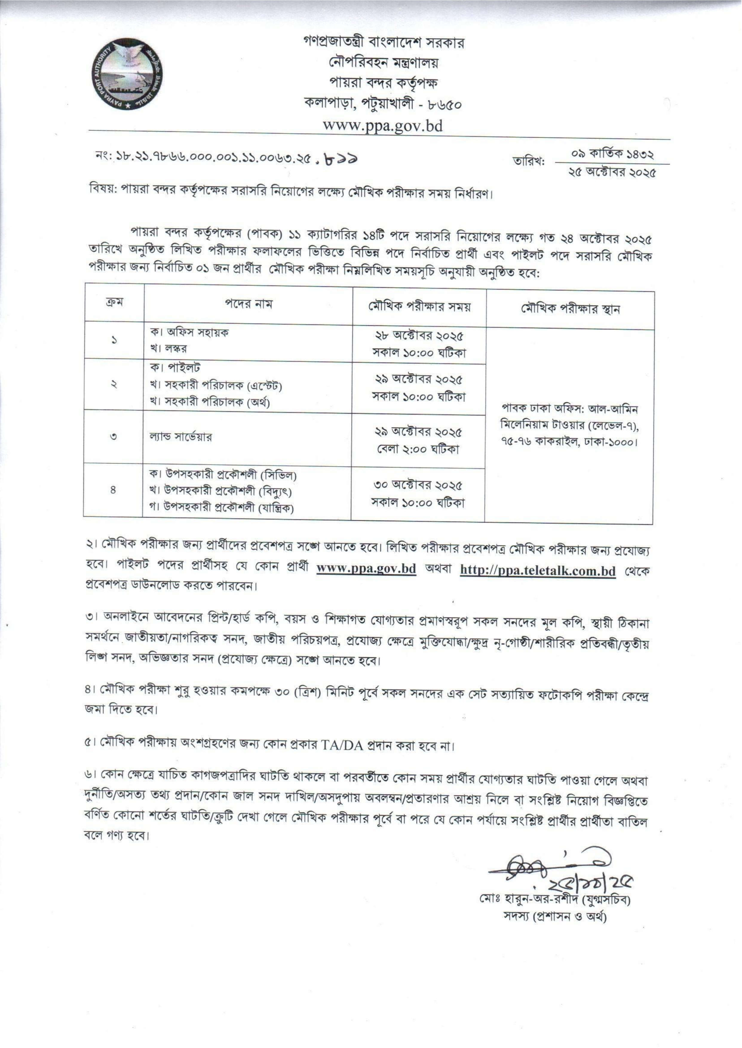 পায়রা বন্দর কর্তৃপক্ষের (পাবক) ১১ ক্যাটাগরির ১৪টি পদে সরাসরি নিয়োগের লক্ষ্যে গত ২৪ অক্টোবর ২০২৫ তারিখে অনুষ্ঠিত লিখিত পরীক্ষার ফলাফলের ভিত্তিতে এবং পাইলট পদে সরাসরি মৌখিক পরীক্ষার জন্য নির্বাচিত প্রার্থীদের মৌখিক পরীক্ষার সময়সূচি প্রকাশ করা হয়েছে।
