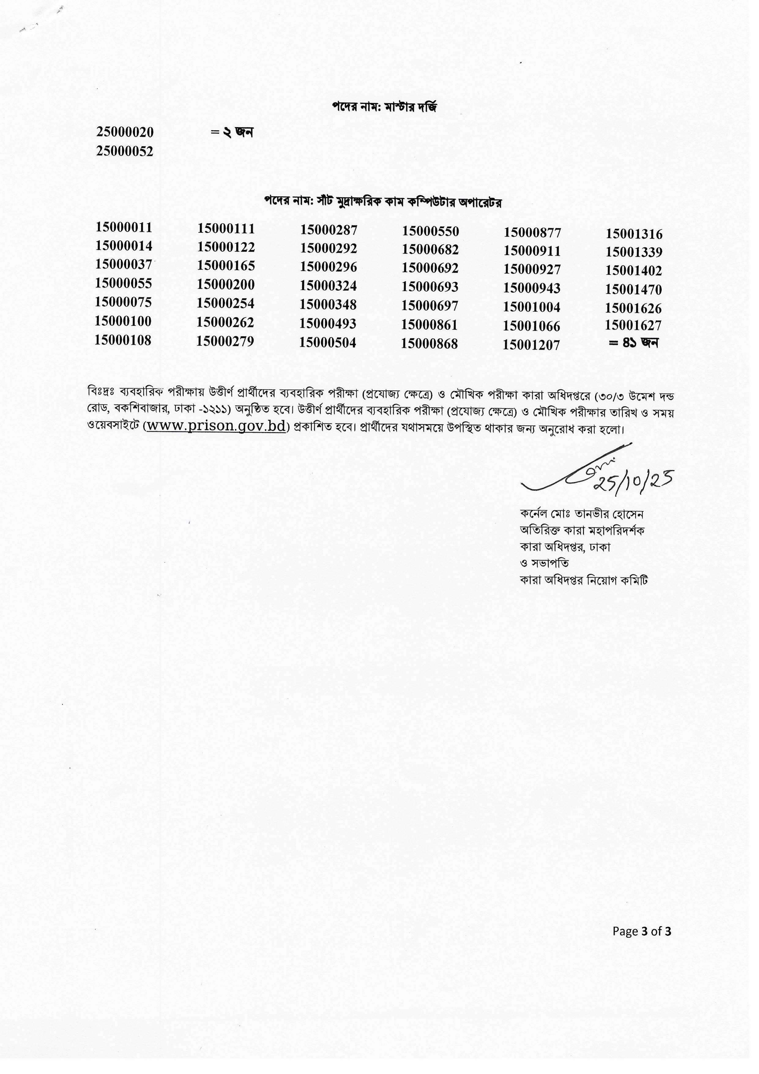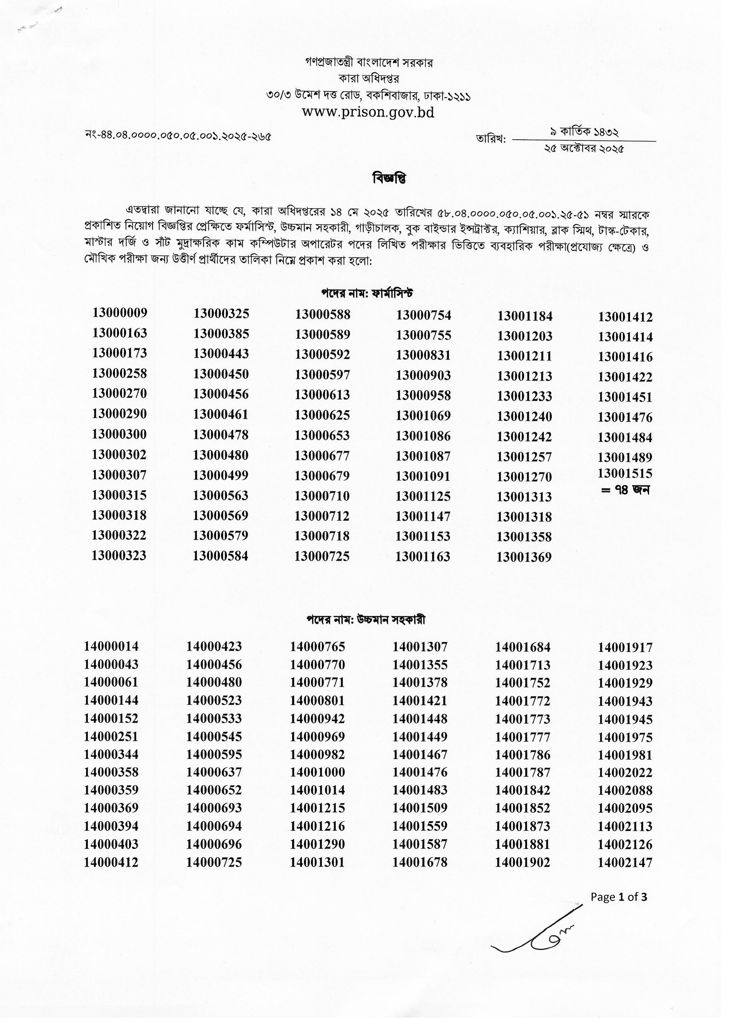 - পরীক্ষার তারিখ ও সময়: উত্তীর্ণ প্রার্থীদের ব্যবহারিক পরীক্ষা ও মৌখিক পরীক্ষার তারিখ ও সময় কারা অধিদপ্তরের অফিসিয়াল ওয়েবসাইটে (dg.prison.gov.bd) পরবর্তীতে জানানো হবে।