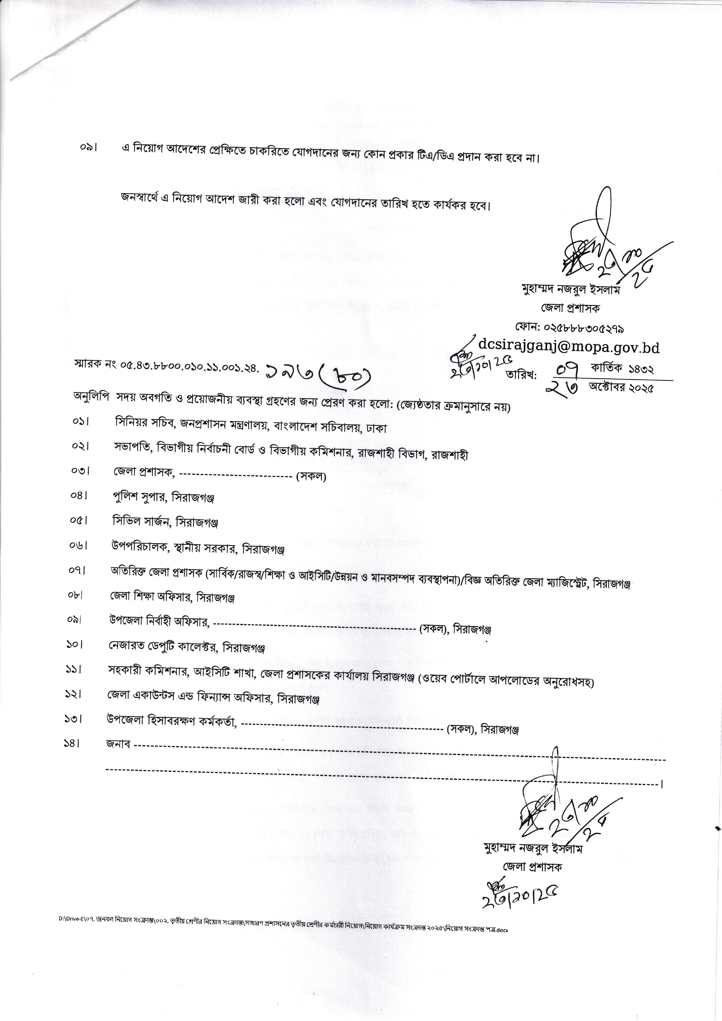 নিয়োগপ্রাপ্ত প্রার্থীকে আগামী ০২/১১/২০২৫ তারিখের মধ্যে জেলা প্রশাসক, সিরাজগঞ্জ বরাবর যোগদানপত্র দাখিল করতে হবে।