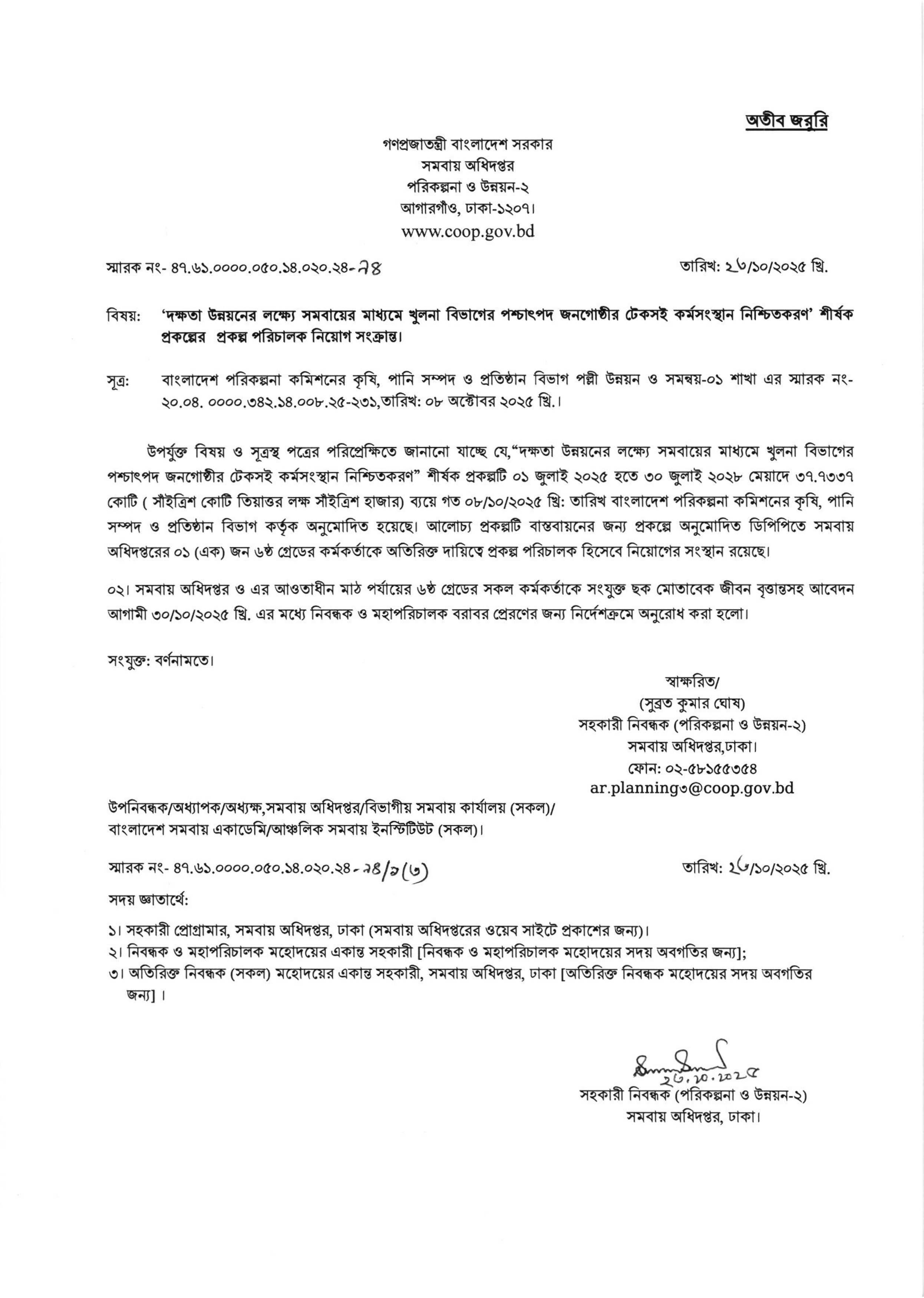 গণপ্রজাতন্ত্রী বাংলাদেশ সরকারের সমবায় অধিদপ্তর কর্তৃক "দক্ষতা উন্নয়নের লক্ষ্যে সমবায়ের মাধ্যমে খুলনা বিভাগের পশ্চাৎপদ জনগোষ্ঠীর টেকসই কর্মসংস্থান নিশ্চিতকরণ" শীর্ষক প্রকল্পে প্রকল্প পরিচালক পদে নিয়োগের জন্য আবেদন আহ্বান করা হয়েছে। এই প্রকল্পে ০১ (এক) জন প্রকল্প পরিচালক নিয়োগ করা হবে।