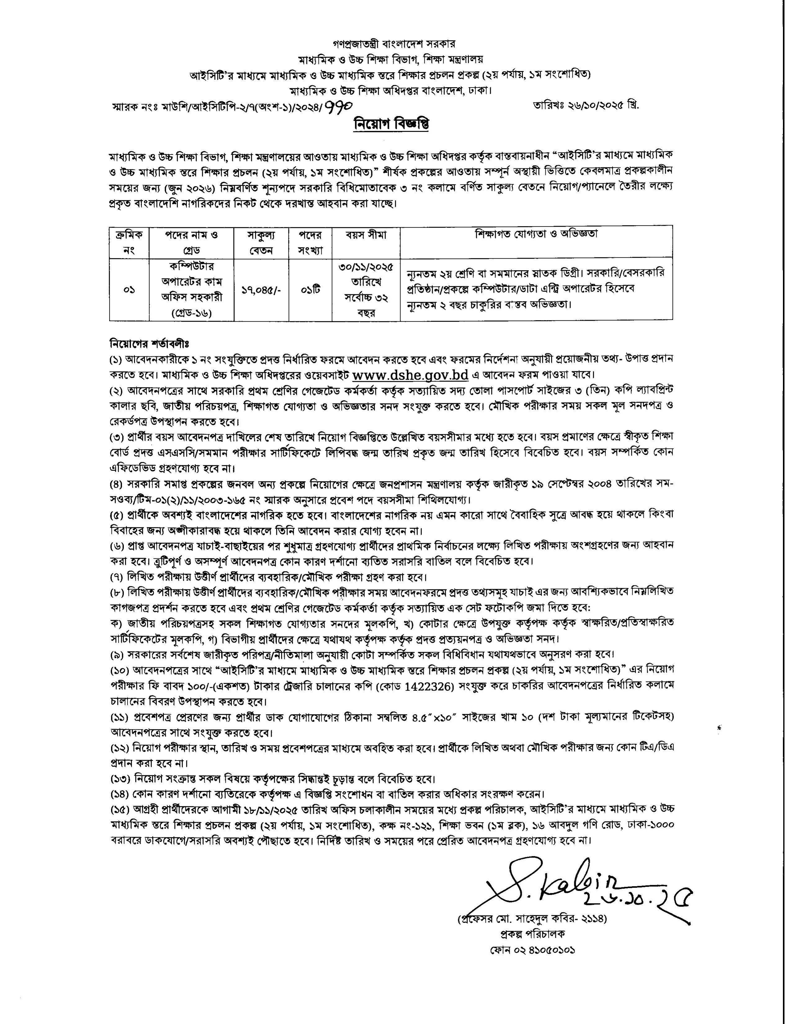 মাধ্যমিক ও উচ্চ শিক্ষা বিভাগ, শিক্ষা মন্ত্রণালয়ের আওতায় মাধ্যমিক ও উচ্চ শিক্ষা অধিদপ্তর কর্তৃক বাস্তবায়নাধীন “আইসিটি”র মাধ্যমে মাধ্যমিক ও উচ্চ মাধ্যমিক স্তরে শিক্ষার প্রচলন (২য় পর্যায়, ১ম সংশোধিত)” শীর্ষক প্রকল্পের আওতায় সম্পূর্ণ অস্থায়ী ভিত্তিতে কিছু সংখ্যক শূন্যপদে লোক নিয়োগের জন্য যোগ্যতাসম্পন্ন প্রকৃত বাংলাদেশি নাগরিকদের নিকট থেকে দরখাস্ত আহ্বান করা হয়েছে। এই নিয়োগের জন্য কম্পিউটার/ডাটা এন্ট্রি অপারেটর হিসেবে অভিজ্ঞতা সম্পন্ন প্রার্থীরা আবেদন করতে পারবেন।