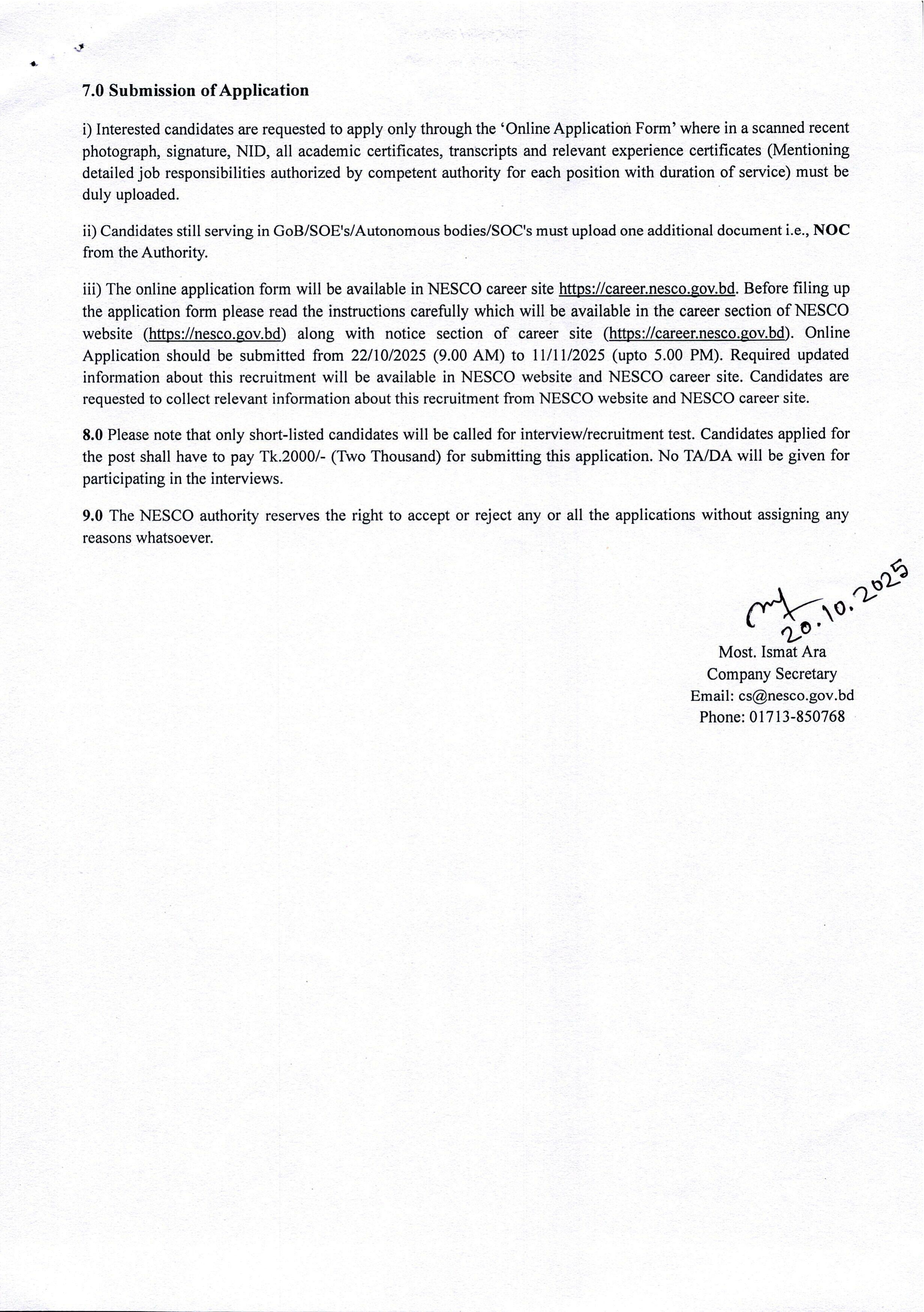 আবেদনের প্রক্রিয়া: আগ্রহী প্রার্থীরা https://nesco.teletalk.com.bd/ ওয়েবসাইটের মাধ্যমে অনলাইনে আবেদন করতে পারবেন। আবেদন ফি বাবদ ২,০০০/- (দুই হাজার) টাকা (অফেরতযোগ্য) টেলিটক প্রিপেইড মোবাইল ব্যবহার করে জমা দিতে হবে।