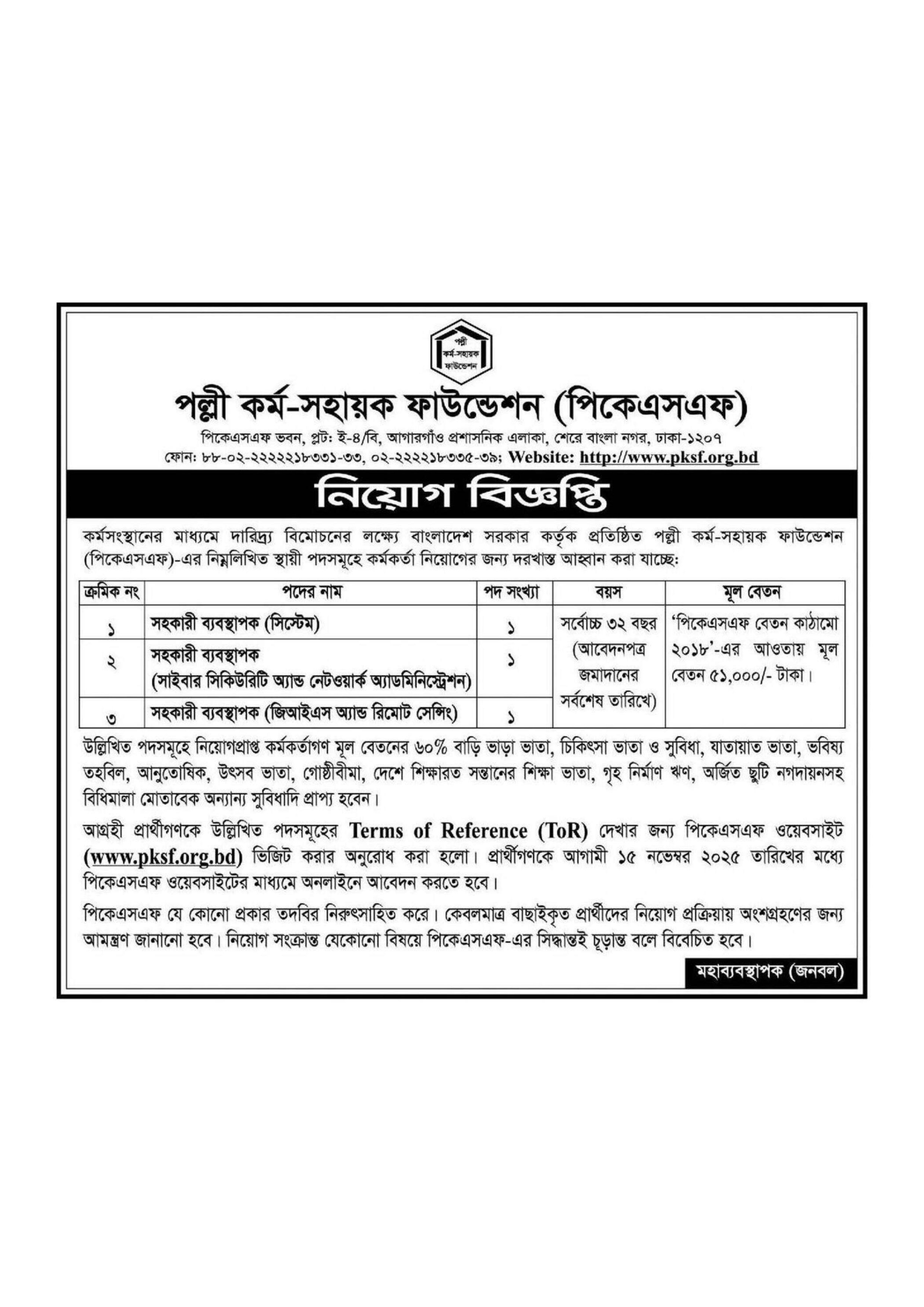কর্মসংস্থানের মাধ্যমে দারিদ্র্য বিমোচনের লক্ষ্যে বাংলাদেশ সরকার কর্তৃক প্রতিষ্ঠিত পল্লী কর্ম-সহায়ক ফাউন্ডেশন (পিকেএসএফ) তাদের নিম্নলিখিত স্থায়ী পদসমূহে কর্মকর্তা নিয়োগের জন্য আবেদন আহ্বান করেছে: