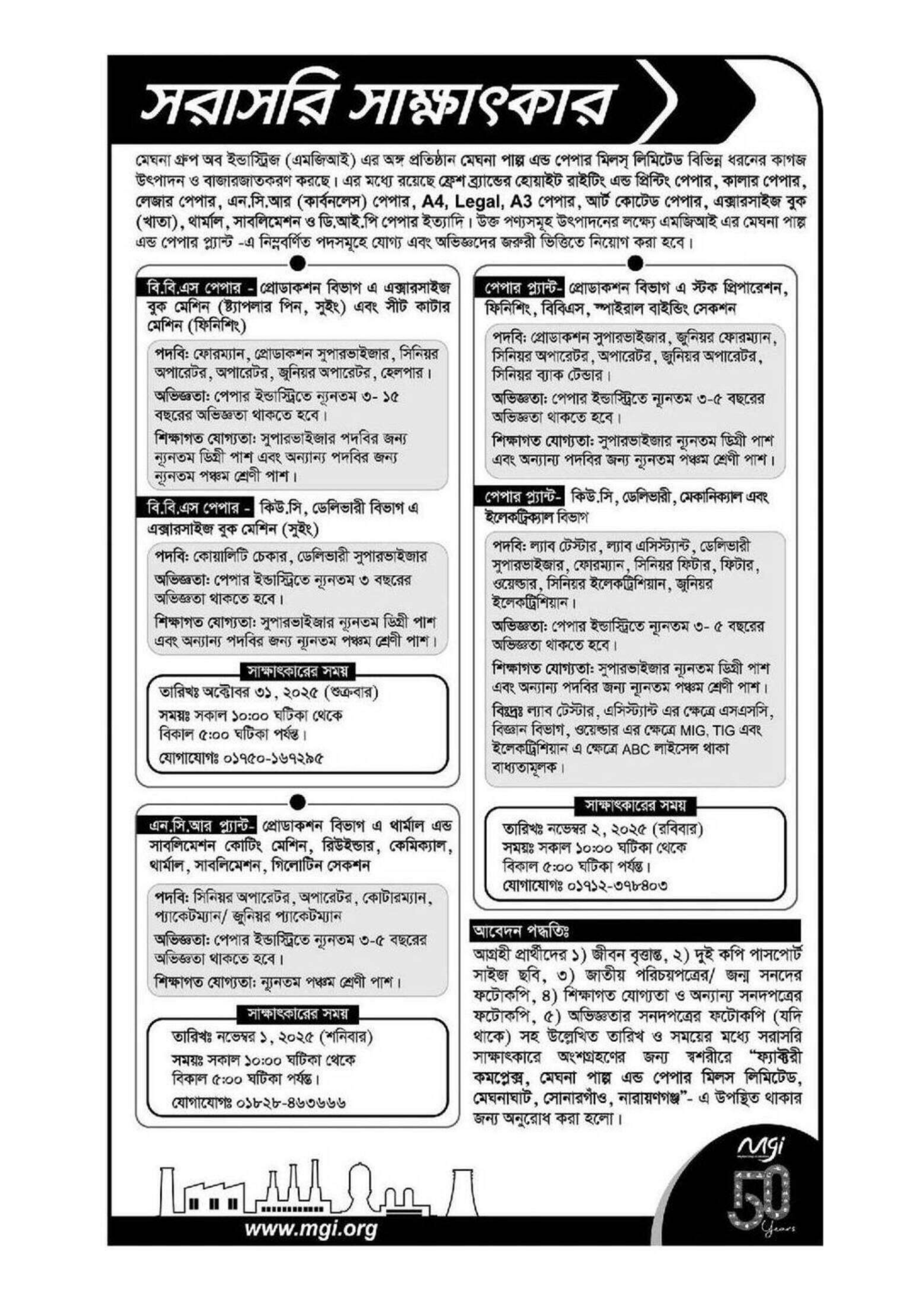 মেঘনা গ্রুপ অব ইন্ডাস্ট্রিজ (এমজিআই) এর অঙ্গ প্রতিষ্ঠান মেঘনা পাল্প এন্ড পেপার মিলস লিমিটেড তাদের বিভিন্ন প্ল্যান্টে জরুরি ভিত্তিতে নিম্নলিখিত পদসমূহে যোগ্য ও অভিজ্ঞ জনবল নিয়োগ করবে। আগ্রহী প্রার্থীরা সরাসরি সাক্ষাৎকারে অংশগ্রহণ করতে পারবেন: