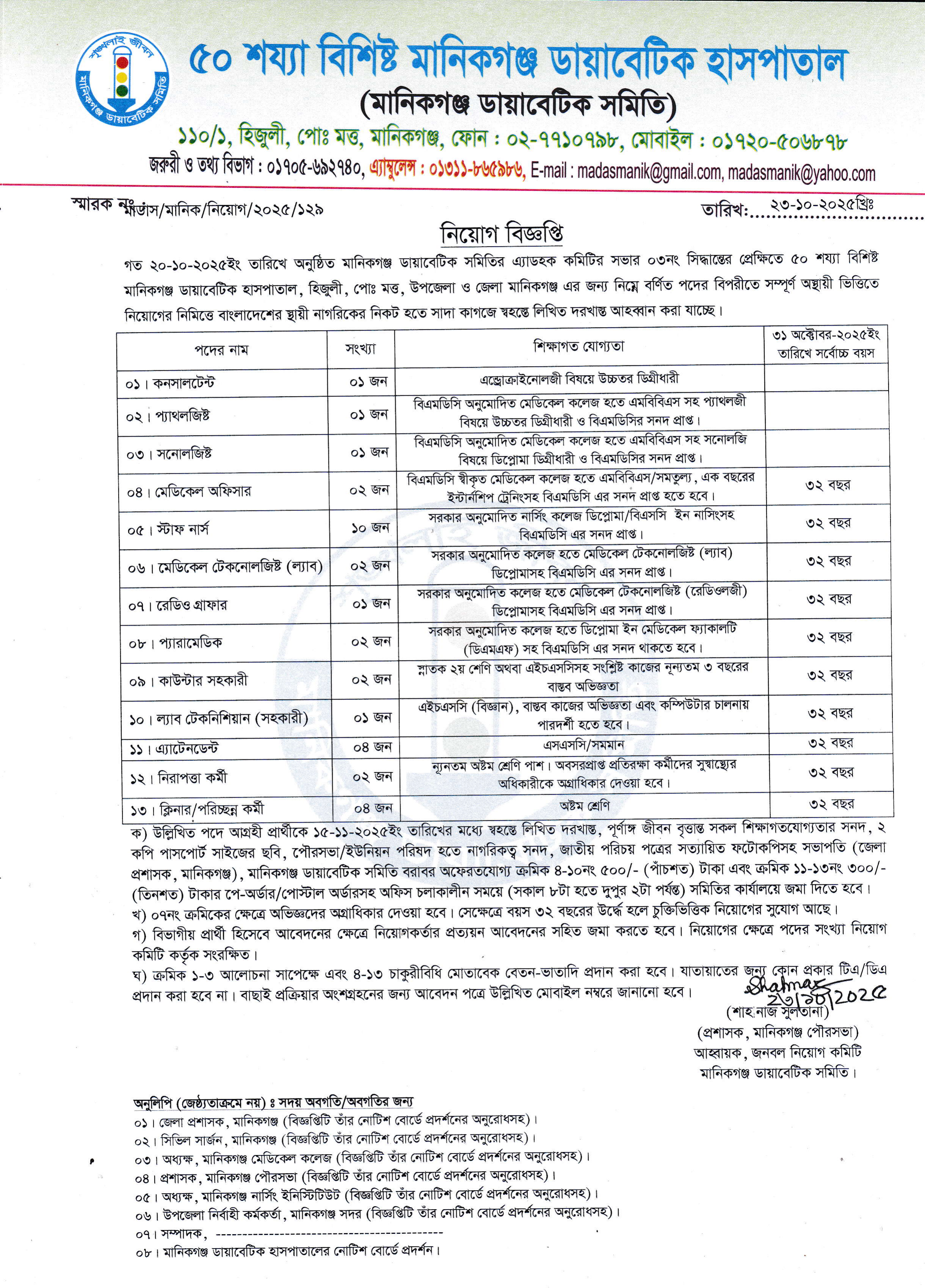 ৫০ শয্যা বিশিষ্ট মানিকগঞ্জ ডায়াবেটিক হাসপাতাল (মানিকগঞ্জ ডায়াবেটিক সমিতি)-এর জন্য সম্পূর্ণ অস্থায়ী ভিত্তিতে নিম্নলিখিত পদসমূহে জনবল নিয়োগের বিজ্ঞপ্তি প্রকাশিত হয়েছে: