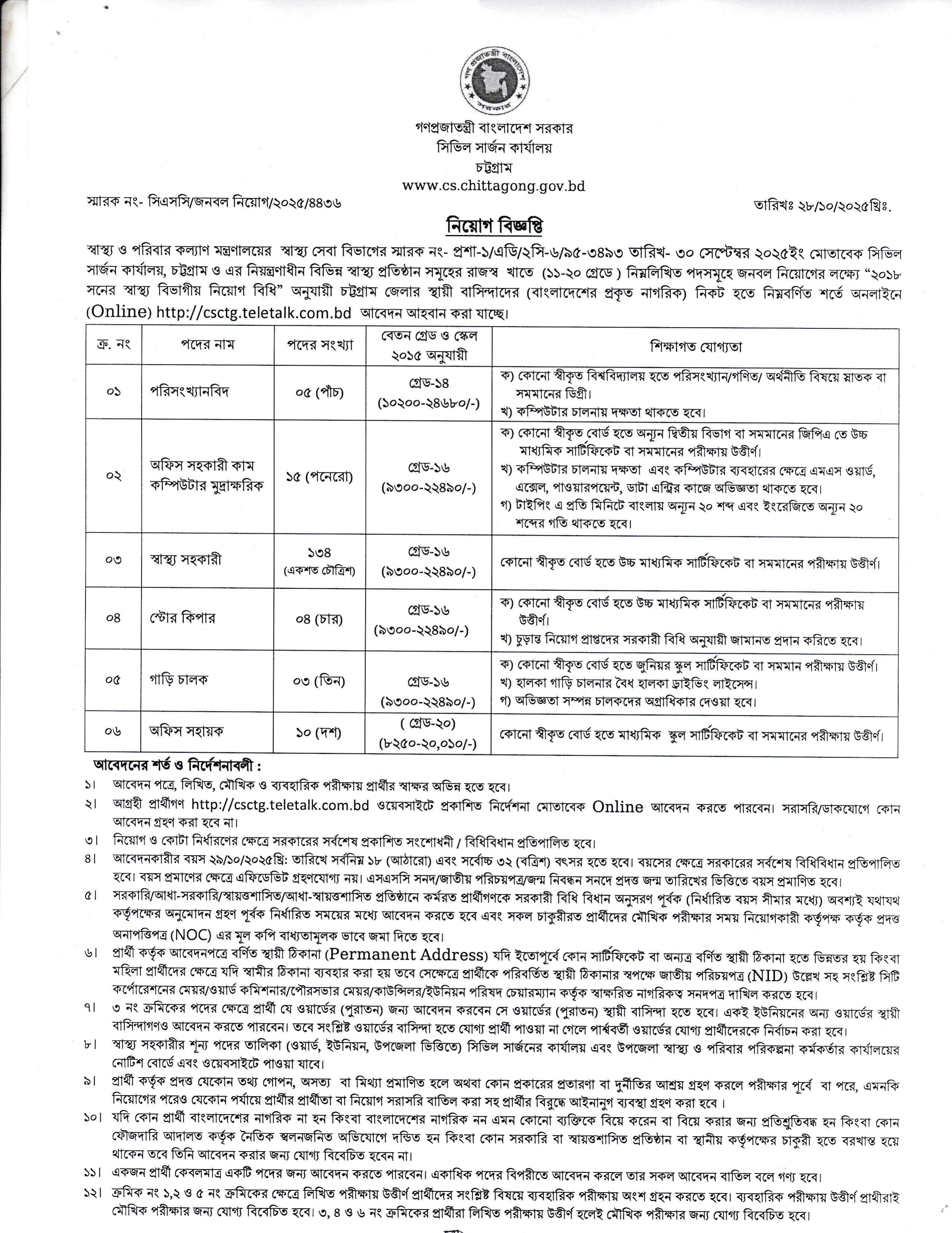 সিভিল সার্জন কার্যালয়, চট্টগ্রাম ও এর নিয়ন্ত্রণাধীন বিভিন্ন স্বাস্থ্য প্রতিষ্ঠান সমূহের রাজস্ব খাতে (১১-২০ গ্রেডে) মোট ১৭১টি পদে জনবল নিয়োগের জন্য বিজ্ঞপ্তি প্রকাশ করা হয়েছে। চট্টগ্রাম জেলার স্থায়ী বাসিন্দারা (বাংলাদেশের প্রকৃত নাগরিক) এই নিয়োগের জন্য আবেদন করতে পারবেন।