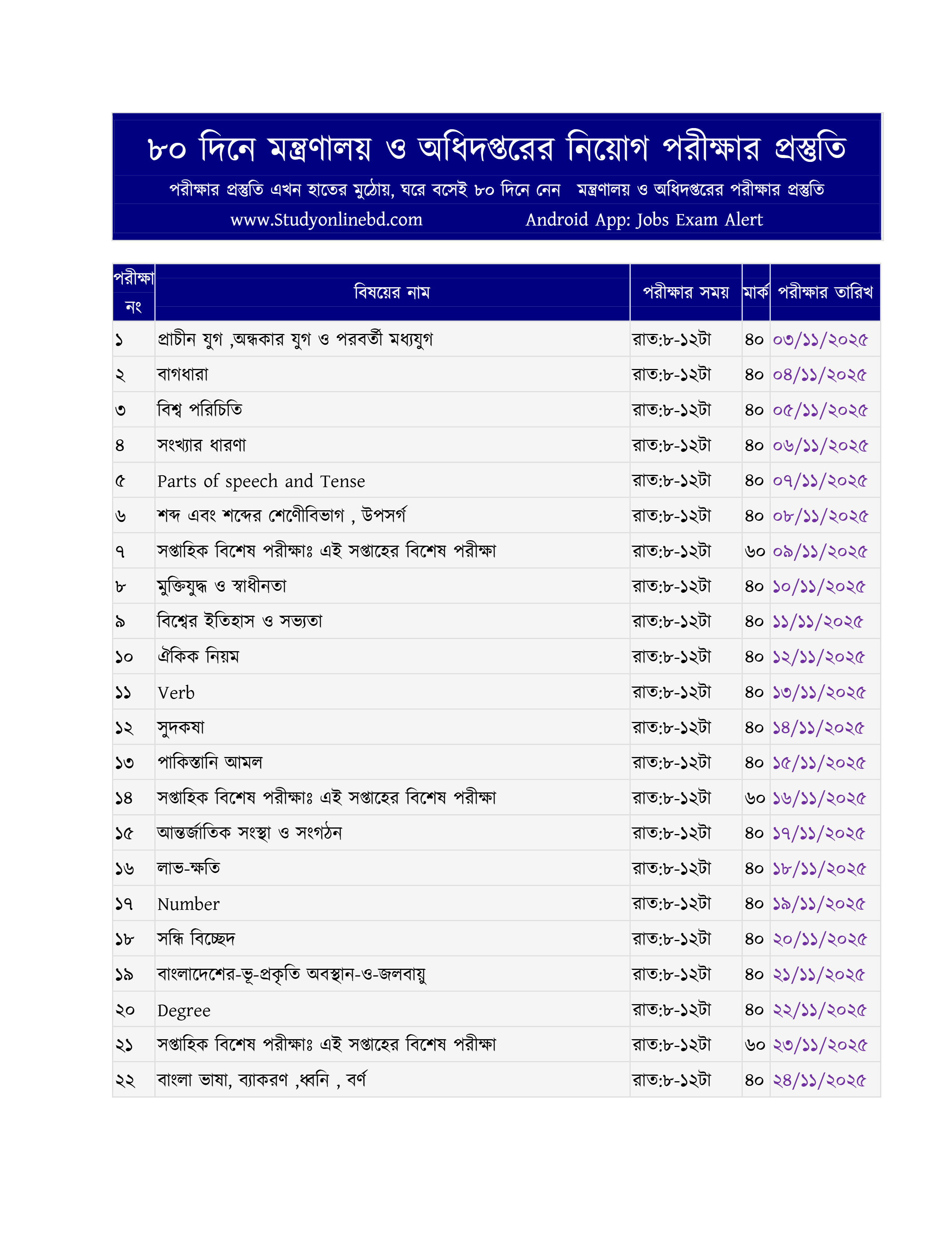 ৮০ দিনে মন্ত্রণালয় ও অধিদপ্তরের নিয়োগ পরীক্ষার প্রস্তুতি শুরু আগামী ০৩-১১-২০২৫ থেকেঃ