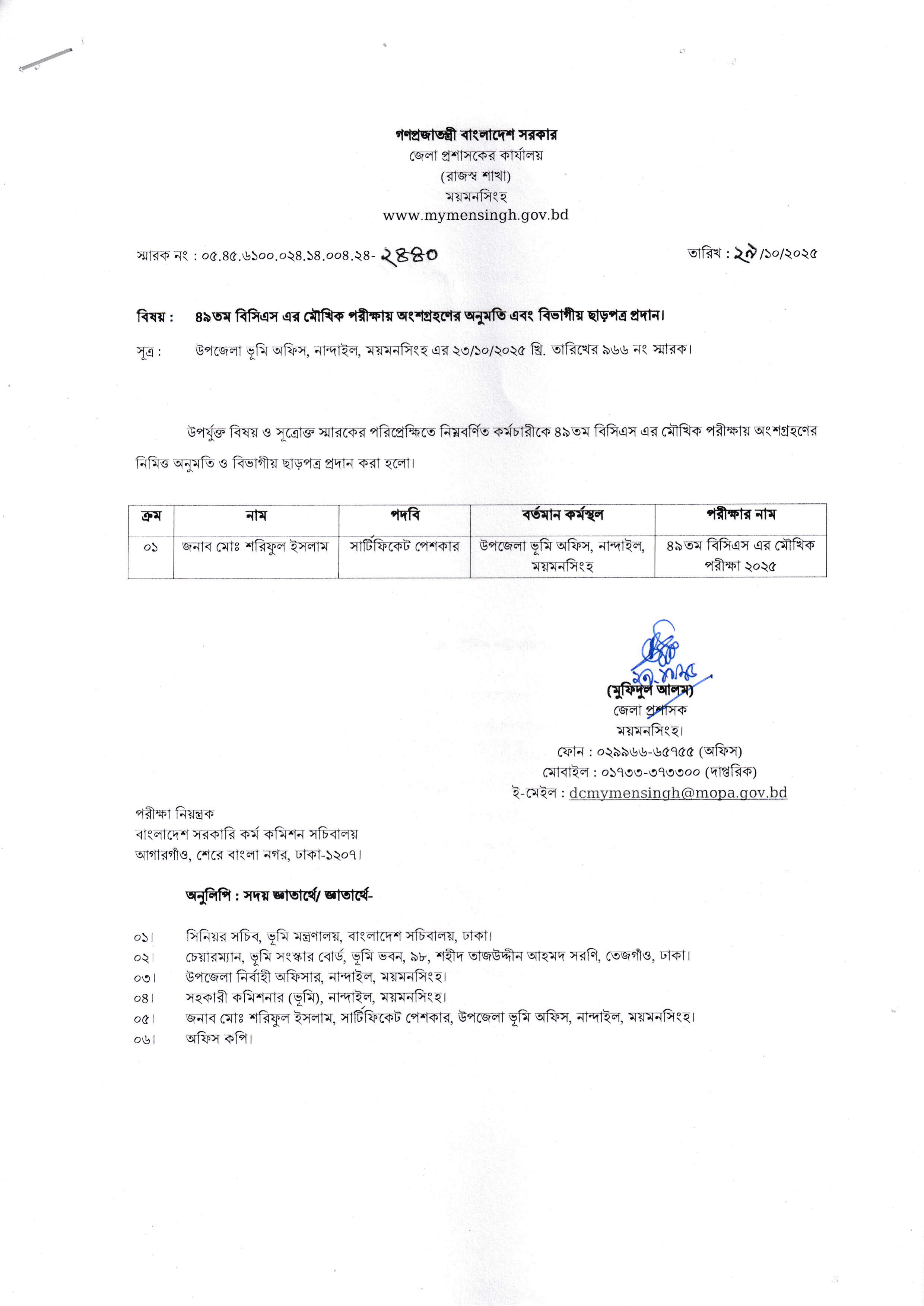 ময়মনসিংহ জেলা প্রশাসকের কার্যালয় (রাজস্ব শাখা) থেকে প্রকাশিত বিজ্ঞপ্তিতে জানানো হয়েছে যে, উপজেলা ভূমি অফিস, নান্দাইল, ময়মনসিংহে কর্মরত জনাব মোঃ শরিফুল ইসলাম, সার্টিফিকেট পেশকার-কে ৪৯তম বিসিএস এর মৌখিক পরীক্ষায় অংশগ্রহণের অনুমতি এবং বিভাগীয় ছাড়পত্র প্রদান করা হয়েছে।