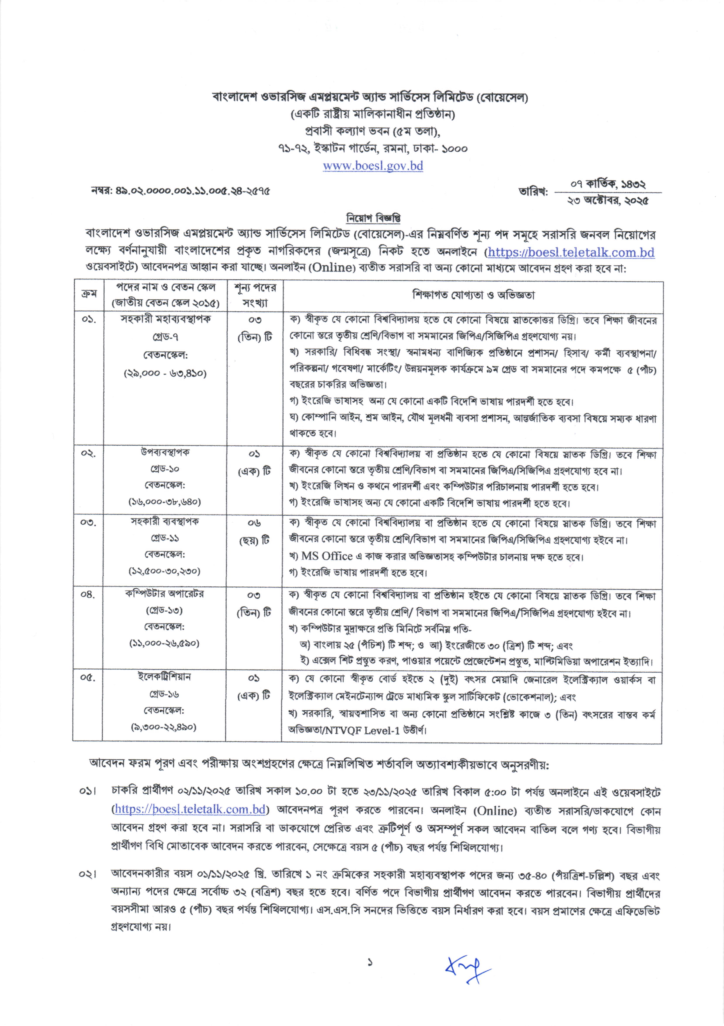 বাংলাদেশ ওভারসিজ এমপ্লয়মেন্ট আ্যান্ড সার্ভিসেস লিমিটেড (বোয়েসেল) তাদের নিম্নবর্ণিত শূন্য পদসমূহে জনবল নিয়োগের জন্য বিজ্ঞপ্তি প্রকাশ করেছে। আগ্রহী ও যোগ্য প্রার্থীরা অনলাইনে আবেদন করতে পারবেন।