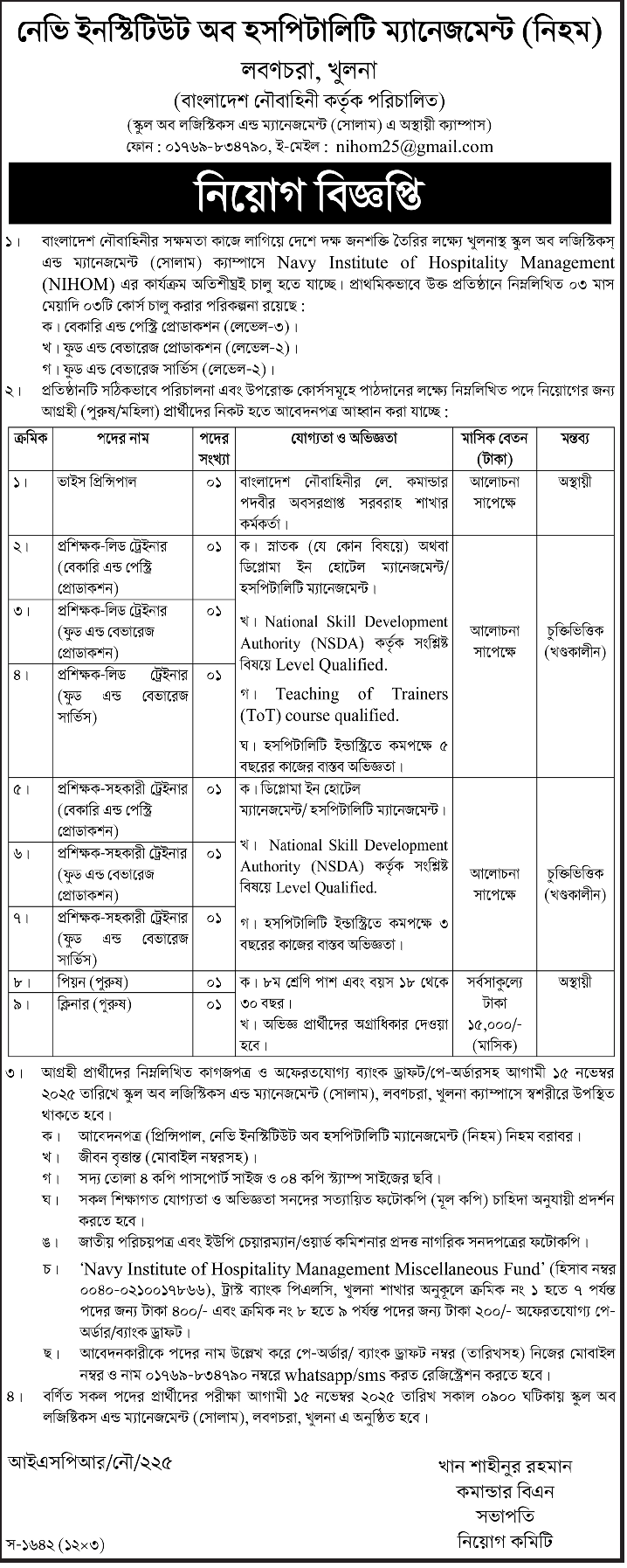 নেভি ইনস্টিটিউট অব হসপিটালিটি ম্যানেজমেন্ট (নিহম) এর নিয়োগ বিজ্ঞপ্তি প্রকাশ