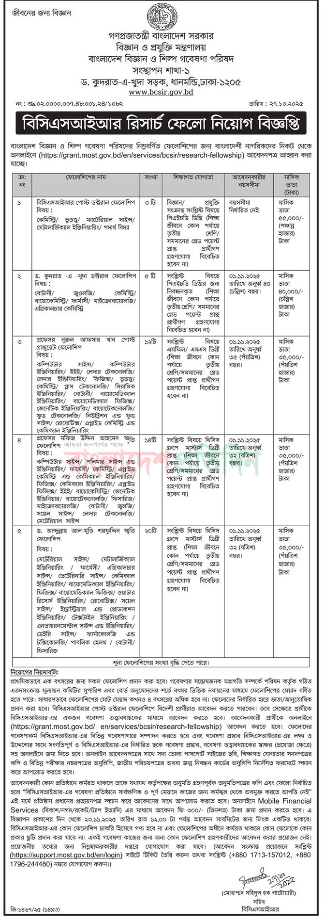বিসিএসআইআর রিসার্চ ফেলো নিয়োগ বিজ্ঞপ্তি