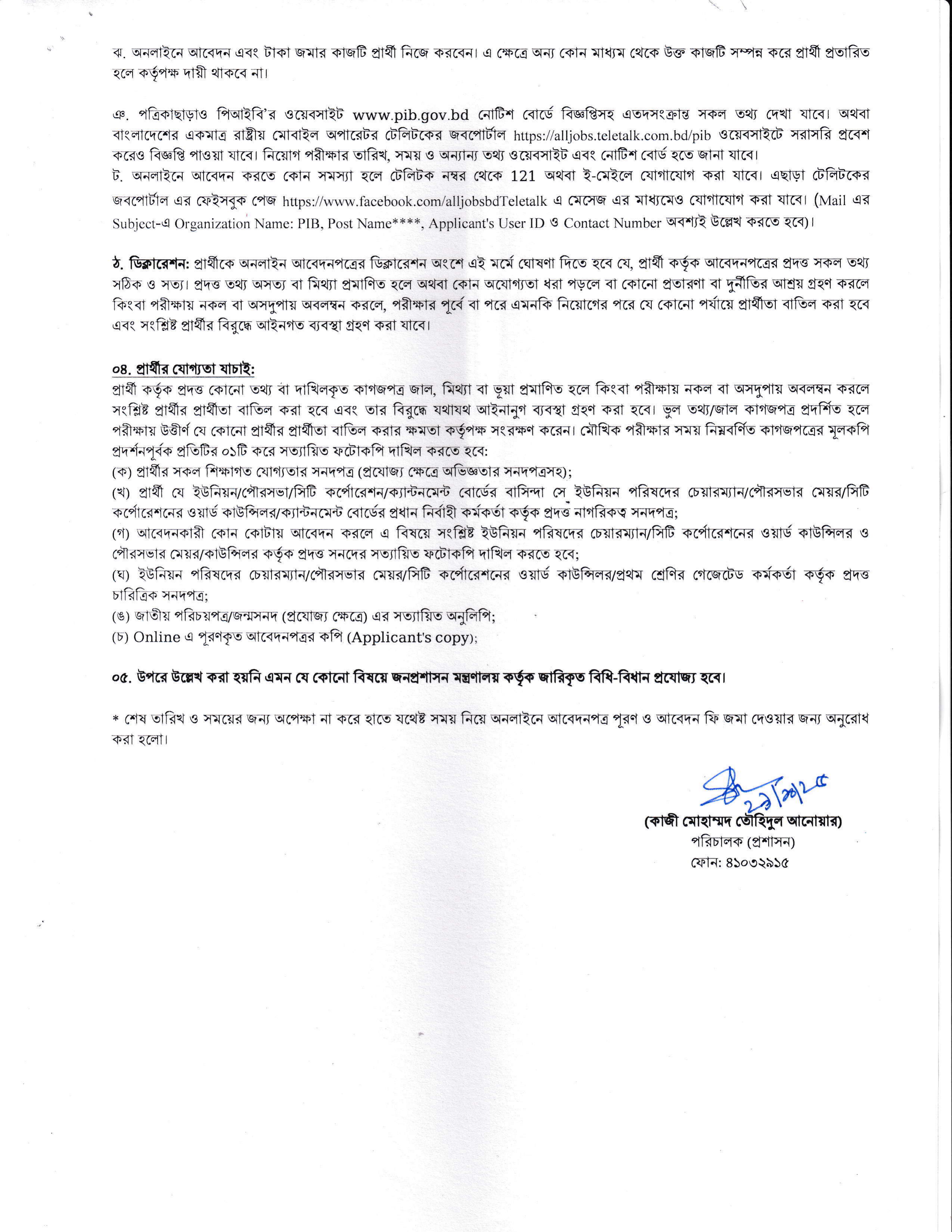 পরীক্ষার তথ্য: নিয়োগ পরীক্ষার তারিখ, সময় ও স্থান সংক্রান্ত তথ্য প্রেস ইনস্টিটিউট বাংলাদেশ (পিআইবি)-এর ওয়েবসাইট (pib.gov.bd) এবং প্রার্থীর মোবাইল ফোনে SMS-এর মাধ্যমে যথাসময়ে জানানো হবে। লিখিত ও মৌখিক পরীক্ষায় অংশগ্রহণের জন্য কোনো প্রকার টিএ/ডিএ প্রদান করা হবে না।