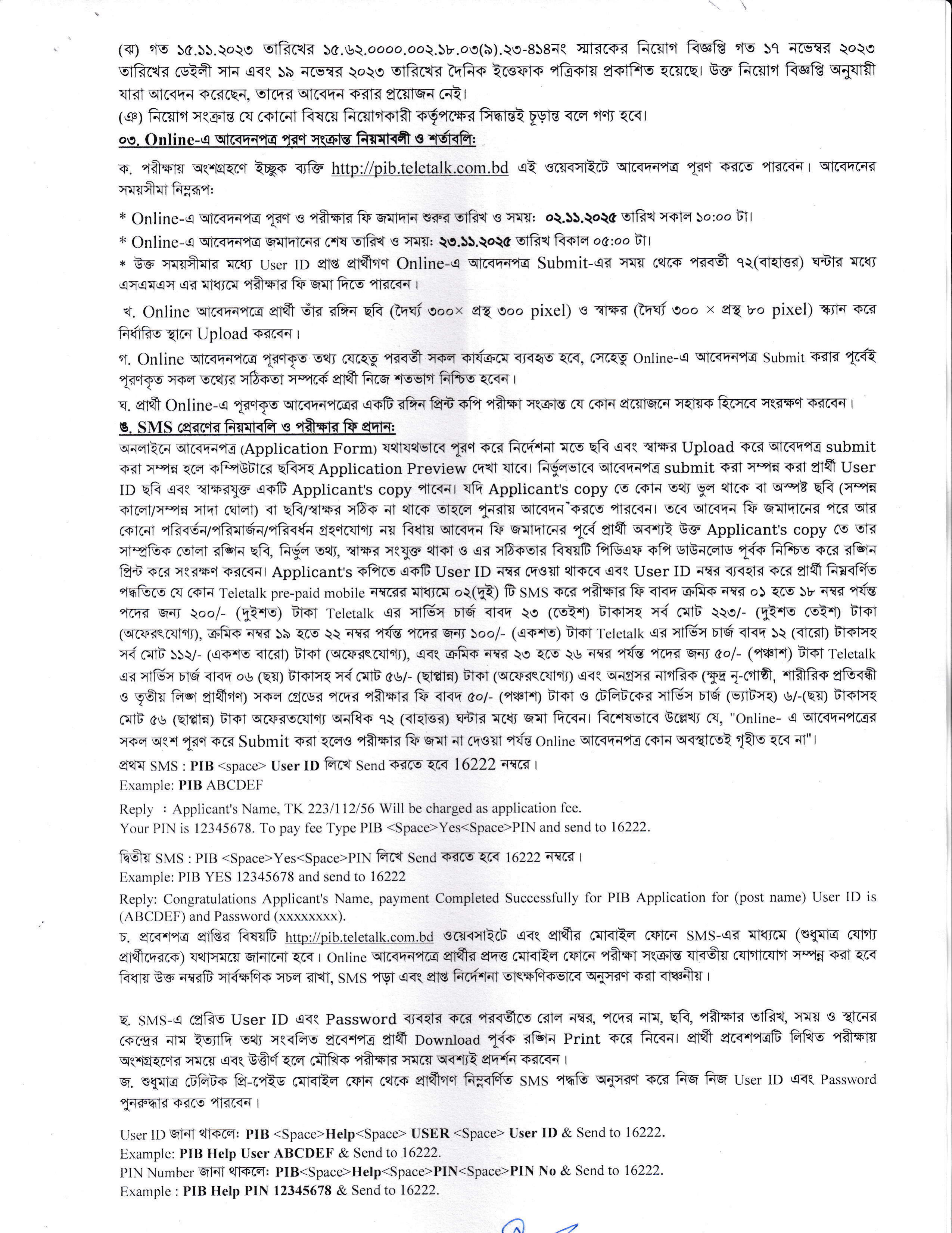আবেদনের প্রক্রিয়া: আগ্রহী প্রার্থীরা অনলাইনে http://pib.teletalk.com.bd ওয়েবসাইটের মাধ্যমে আবেদন করতে পারবেন। অনলাইন ব্যতিত অন্য কোনো মাধ্যমে দাখিলকৃত আবেদনপত্র গ্রহণ করা হবে না।