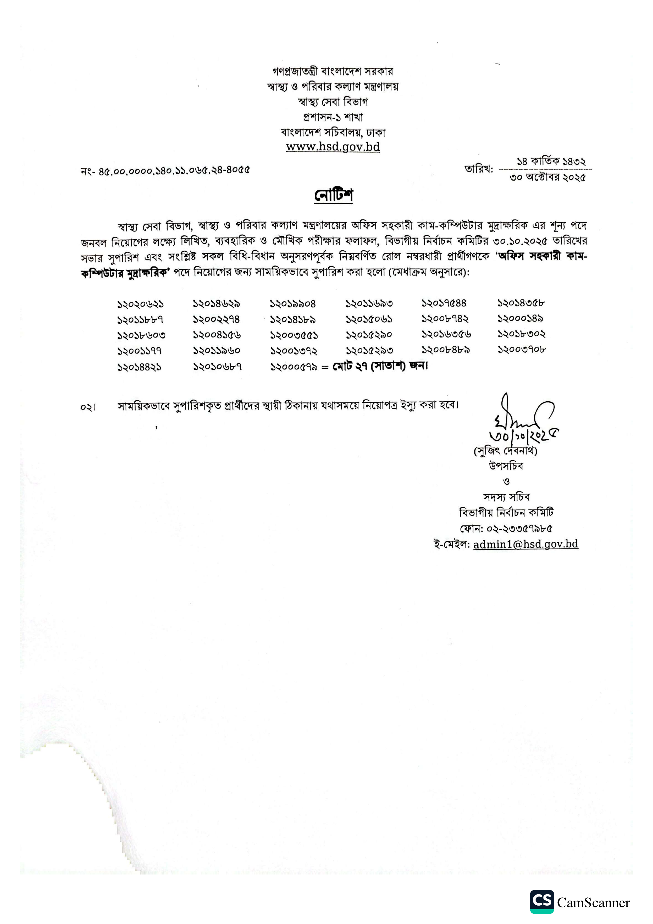 গণপ্রজাতন্ত্রী বাংলাদেশ সরকারের স্বাস্থ্য ও পরিবার কল্যাণ মন্ত্রণালয়ের স্বাস্থ্য সেবা বিভাগ কর্তৃক আয়োজিত জনবল নিয়োগের লক্ষ্যে অনুষ্ঠিত অফিস সহকারী কাম-কম্পিউটার মুদ্রাক্ষরিক পদের লিখিত, ব্যবহারিক ও মৌখিক পরীক্ষার ফলাফল প্রকাশিত হয়েছে।