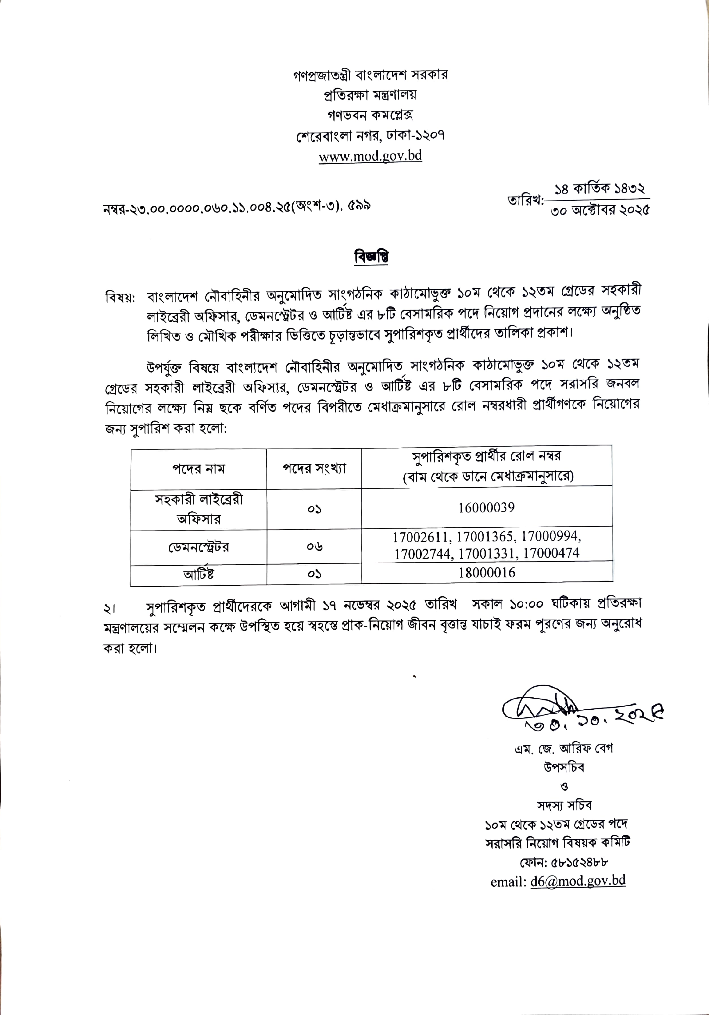সুপারিশকৃত সকল প্রার্থীকে ১৭ নভেম্বর ২০২৫ তারিখে সকাল ১০:০০ ঘটিকায় প্রতিরক্ষা মন্ত্রণালয়ের সম্মেলন কক্ষে উপস্থিত হয়ে স্বহস্তে প্রাক-নিয়োগ জীবন বৃত্তান্ত যাচাই ফরম পূরণের জন্য অনুরোধ জানানো হয়েছে।