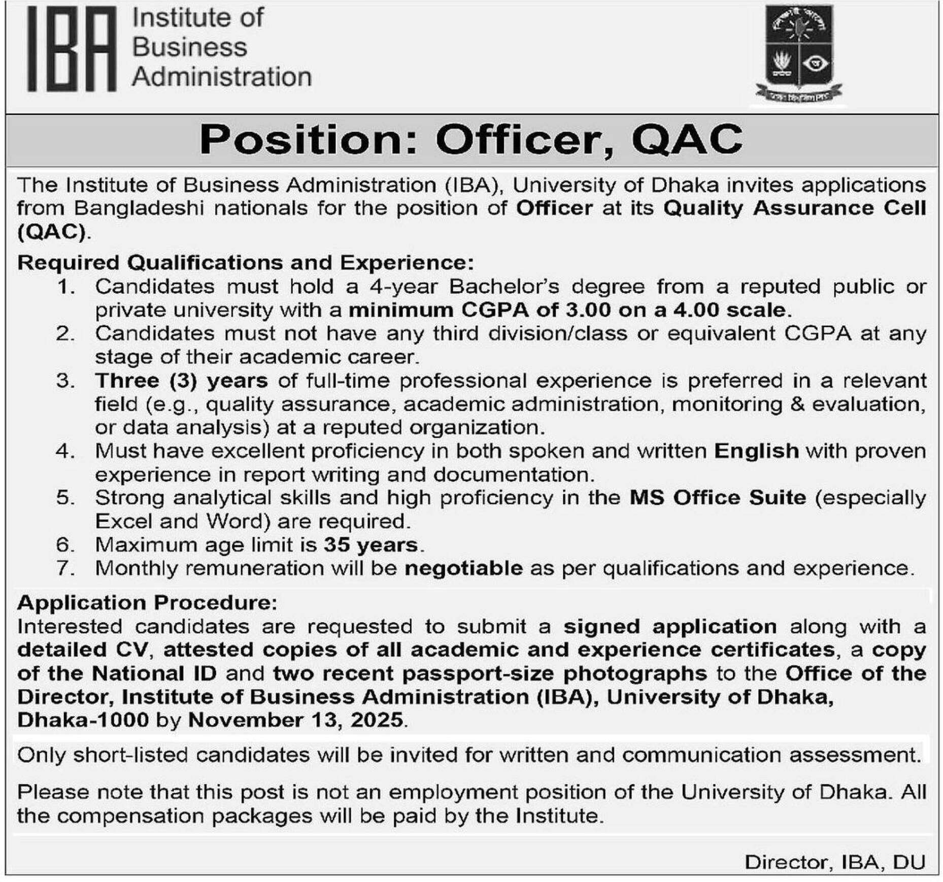 ইনস্টিটিউট অফ বিজনেস অ্যাডমিনিস্ট্রেশন (আইবিএ), ঢাকা বিশ্ববিদ্যালয়, কোয়ালিটি অ্যাসুরেন্স সেল (QAC)-এর জন্য অফিসার পদে বাংলাদেশি নাগরিকদের নিকট থেকে দরখাস্ত আহ্বান করছে।