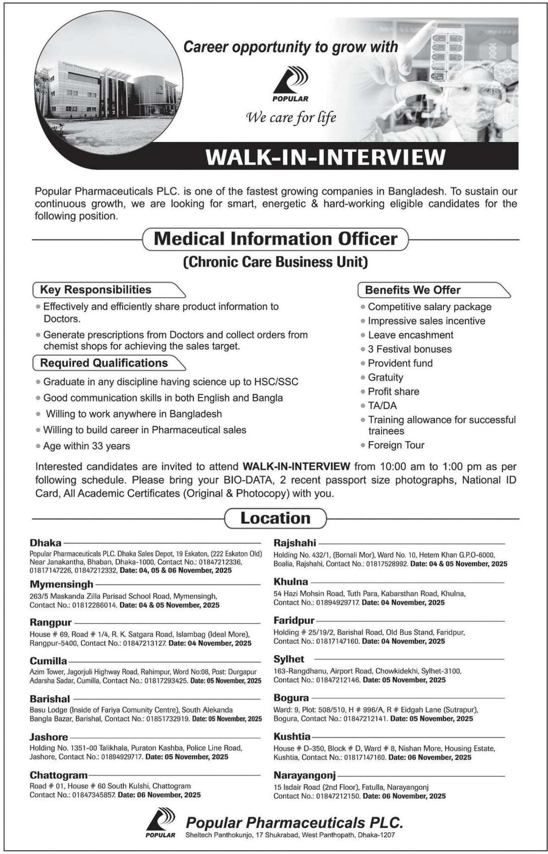 পপুলার ফার্মাসিউটিক্যালস পিএলসি বাংলাদেশের দ্রুত বর্ধনশীল কোম্পানিগুলোর মধ্যে অন্যতম। প্রতিষ্ঠানটি তাদের ক্রমবর্ধমান ব্যবসায়িক লক্ষ্য অর্জনের জন্য স্মার্ট, উদ্যমী ও পরিশ্রমী প্রার্থীদের কাছ থেকে আবেদন আহ্বান করছে।