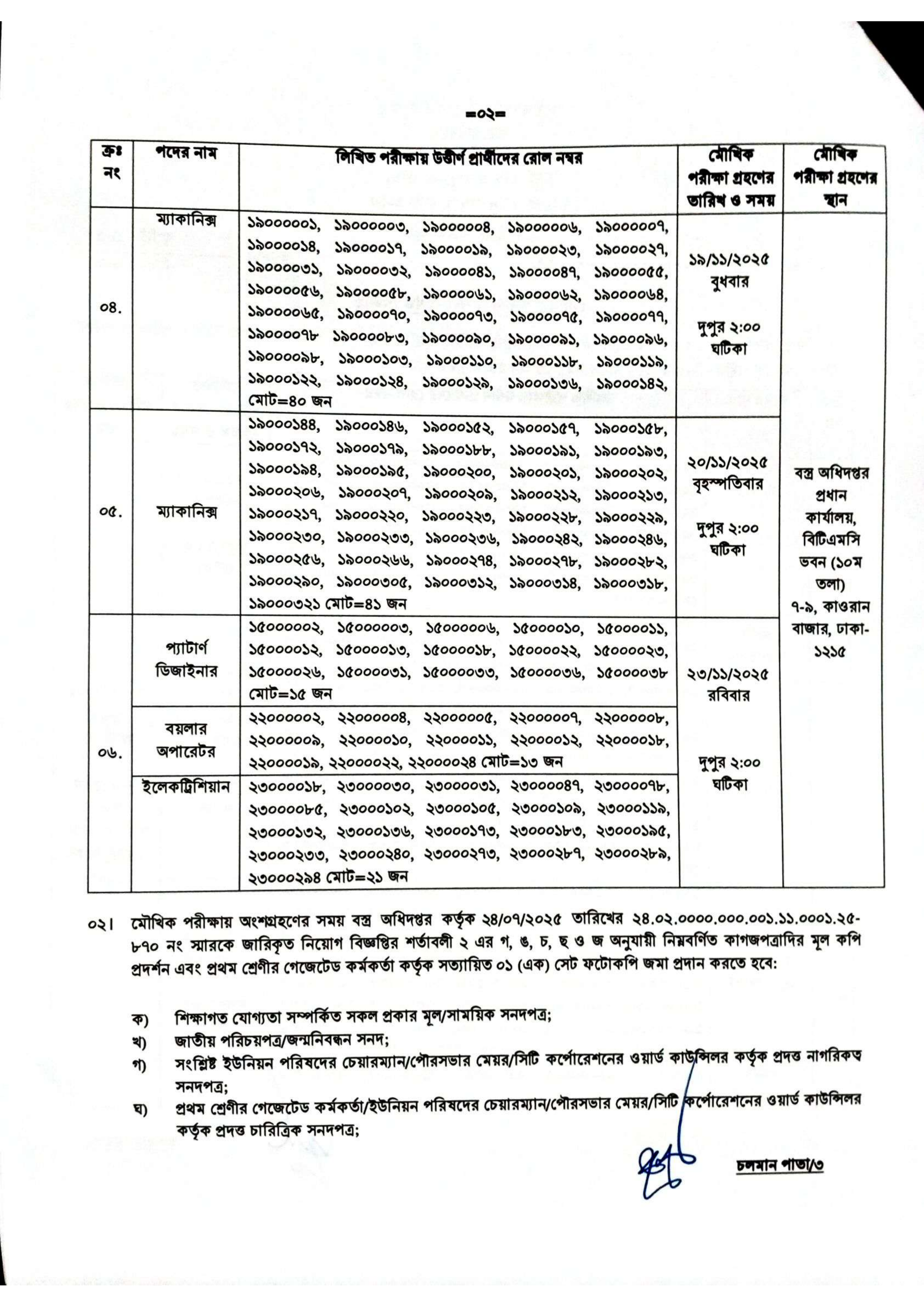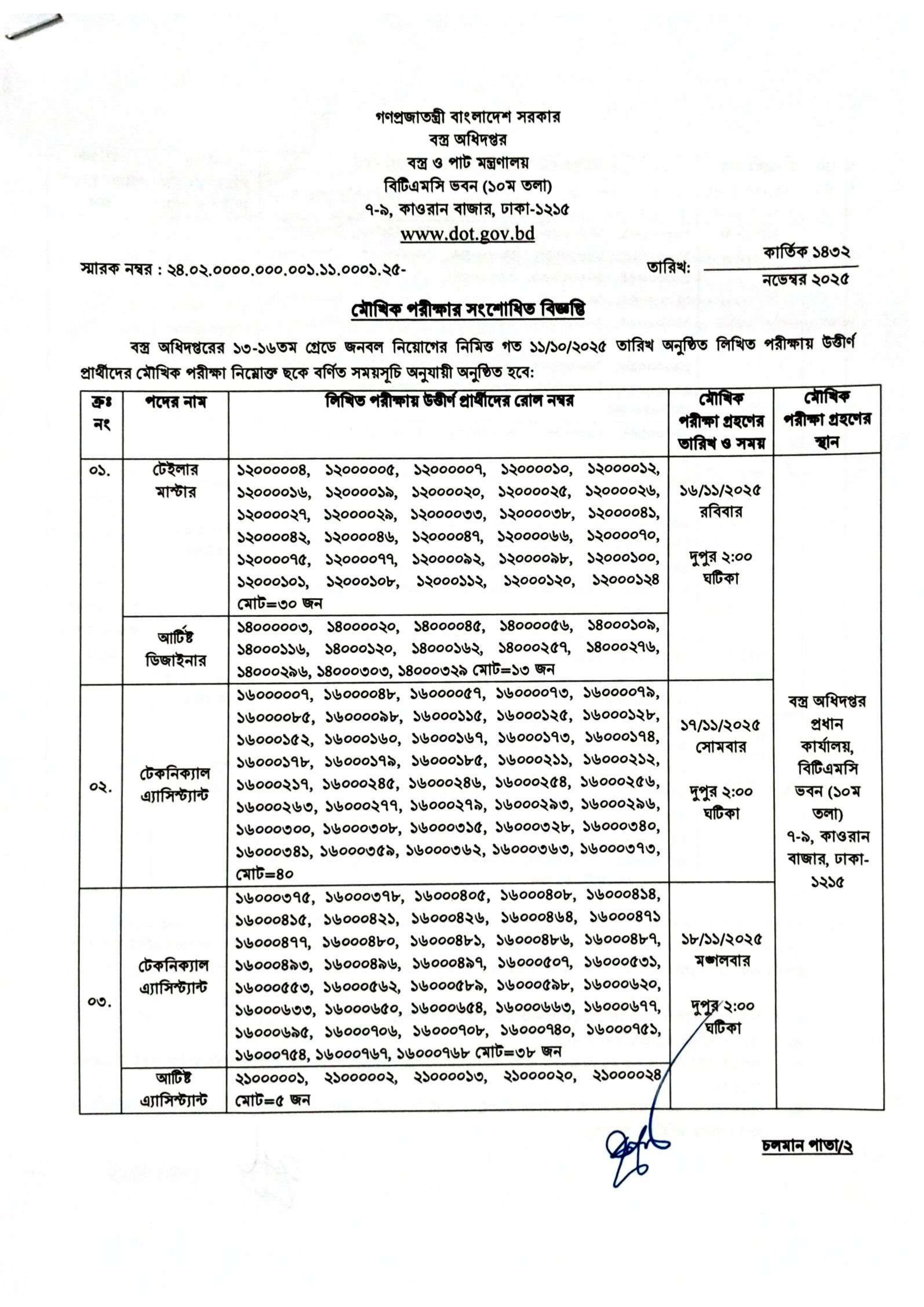 বস্ত্র অধিদপ্তর কর্তৃক গত ১১/১০/২০২৫ তারিখে অনুষ্ঠিত লিখিত পরীক্ষায় উত্তীর্ণ প্রার্থীদের মৌখিক পরীক্ষার সংশোধিত সময়সূচী প্রকাশিত হয়েছে। ১৩-১৬তম গ্রেডে জনবল নিয়োগের জন্য এই মৌখিক পরীক্ষা অনুষ্ঠিত হবে।