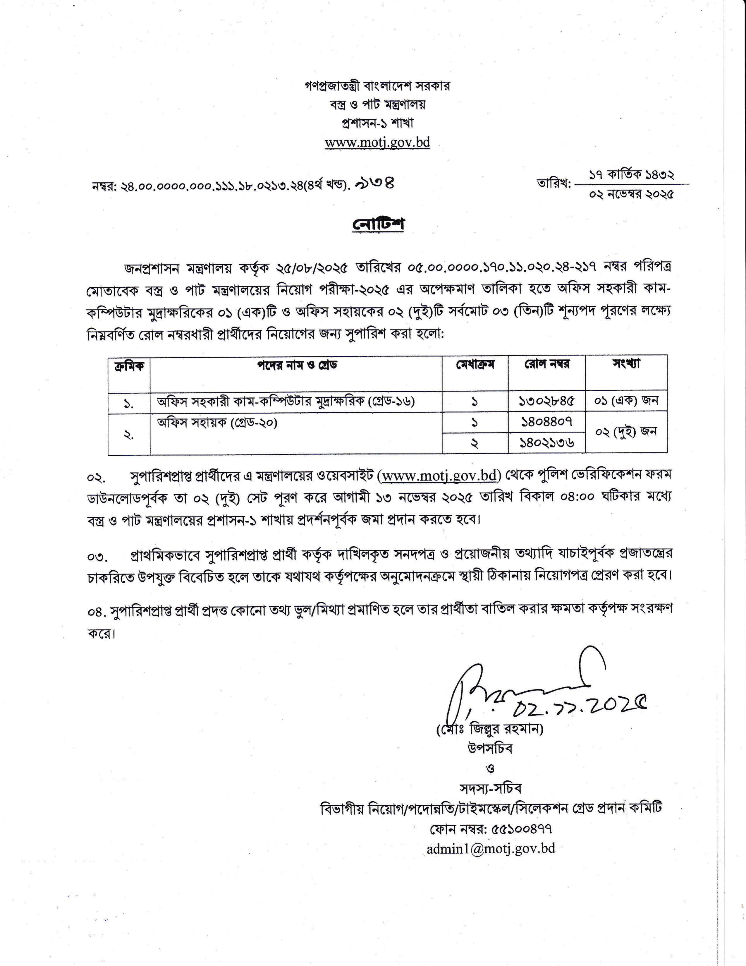 বস্ত্র ও পাট মন্ত্রণালয়ের নিয়োগ পরীক্ষা-২০২৫ এর অপেক্ষমাণ তালিকা হতে প্রার্থীদের নিয়োগের জন্য সুপারিশ করা হয়েছে।