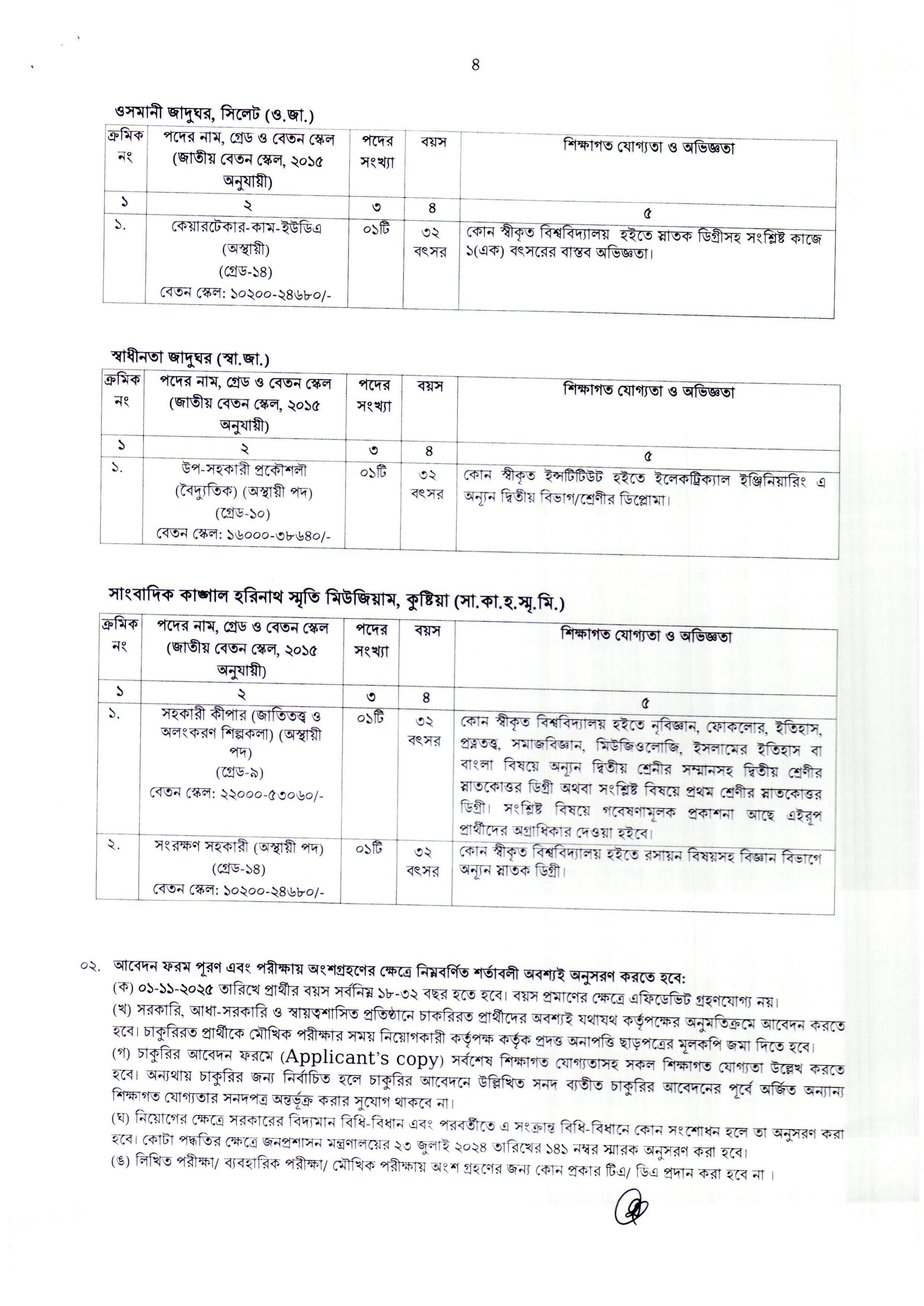 - সহকারী কীপার (জাতিতত্বব ও লোকশিল্পকলা) (অস্থায়ী পদ): ০১টি