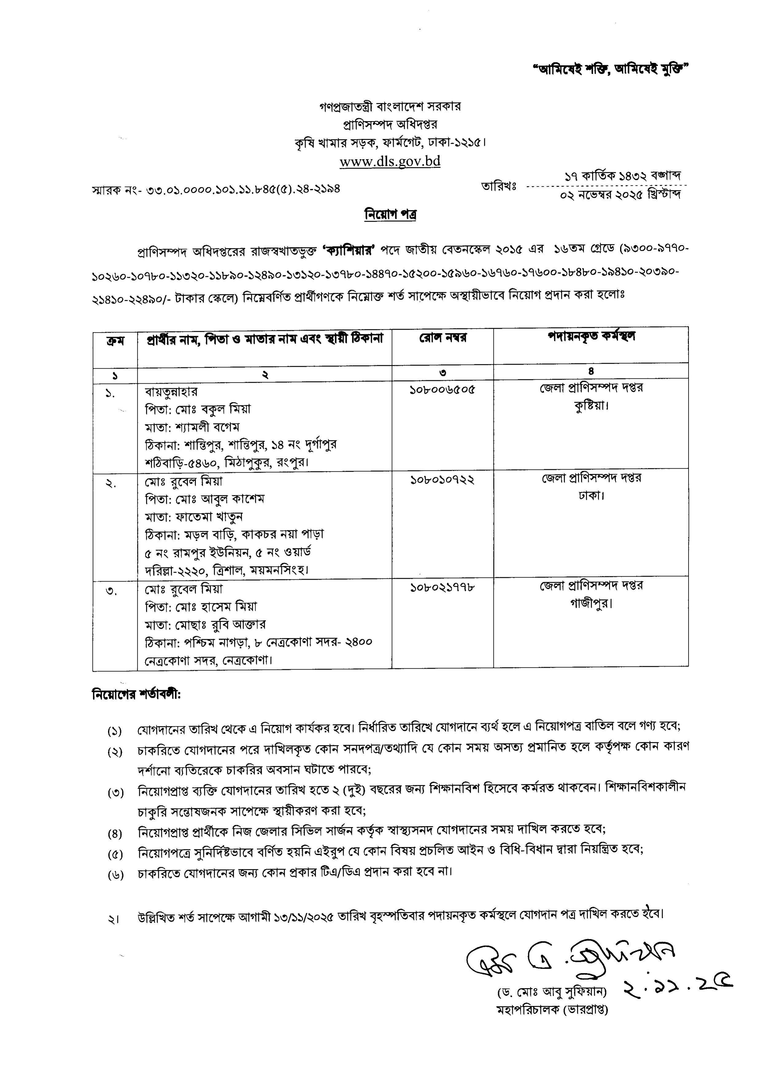 নিয়োগপ্রাপ্ত প্রার্থীদের আগামী ১৩/১১/২০২৫ তারিখ বৃহস্পতিবারের মধ্যে পদায়নকৃত কর্মস্থলে যোগদানপত্র দাখিল করতে হবে। নির্ধারিত তারিখে যোগদানে ব্যর্থ হলে নিয়োগপত্র বাতিল বলে গণ্য হবে।