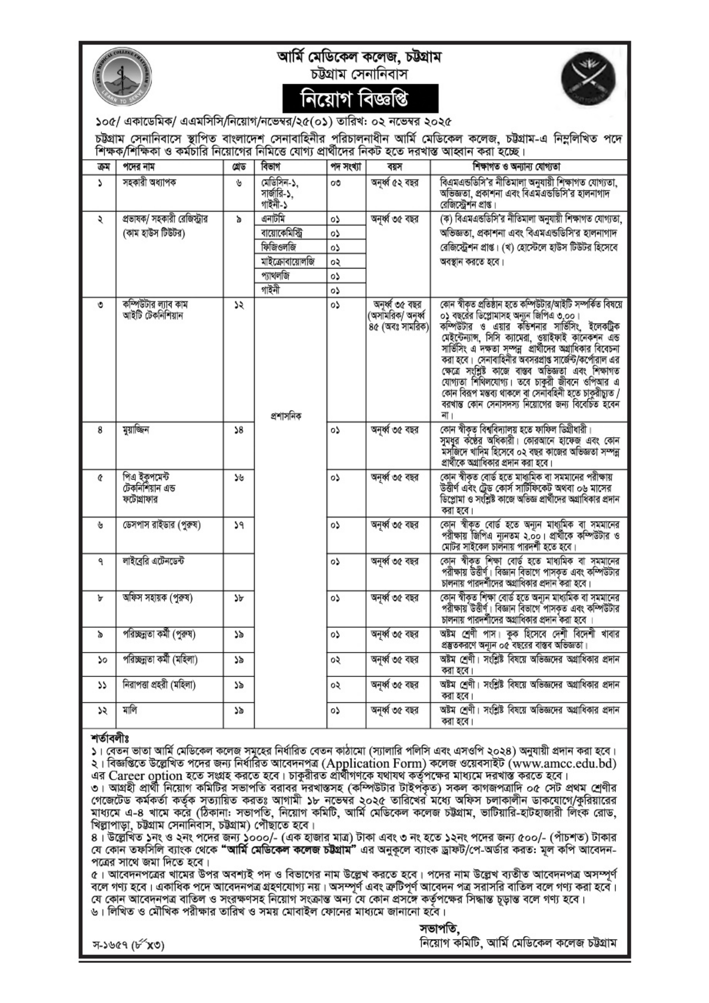 আর্মি মেডিকেল কলেজ, চট্টগ্রাম এ ০৭ ক্যাটাগরির সর্বমোট ১০টি পদে জনবল নিয়োগের জন্য বিজ্ঞপ্তি প্রকাশ করেছে। আগ্রহী ও যোগ্য প্রার্থীরা আবেদন করতে পারবেন।